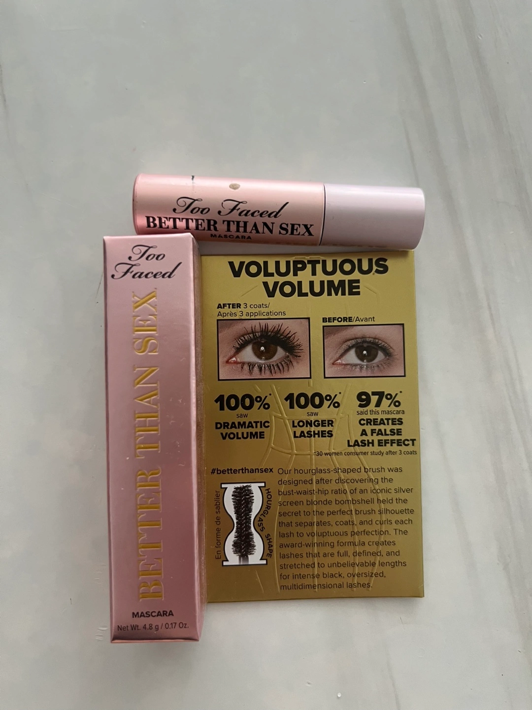 Selling a Too Faced Better Than Sex mascara! It's designed to create dramatic volume and longer lashes. The hourglass-shaped brush helps to separate, coat, and curl each lash for intense black, volumized, multidimensional lashes