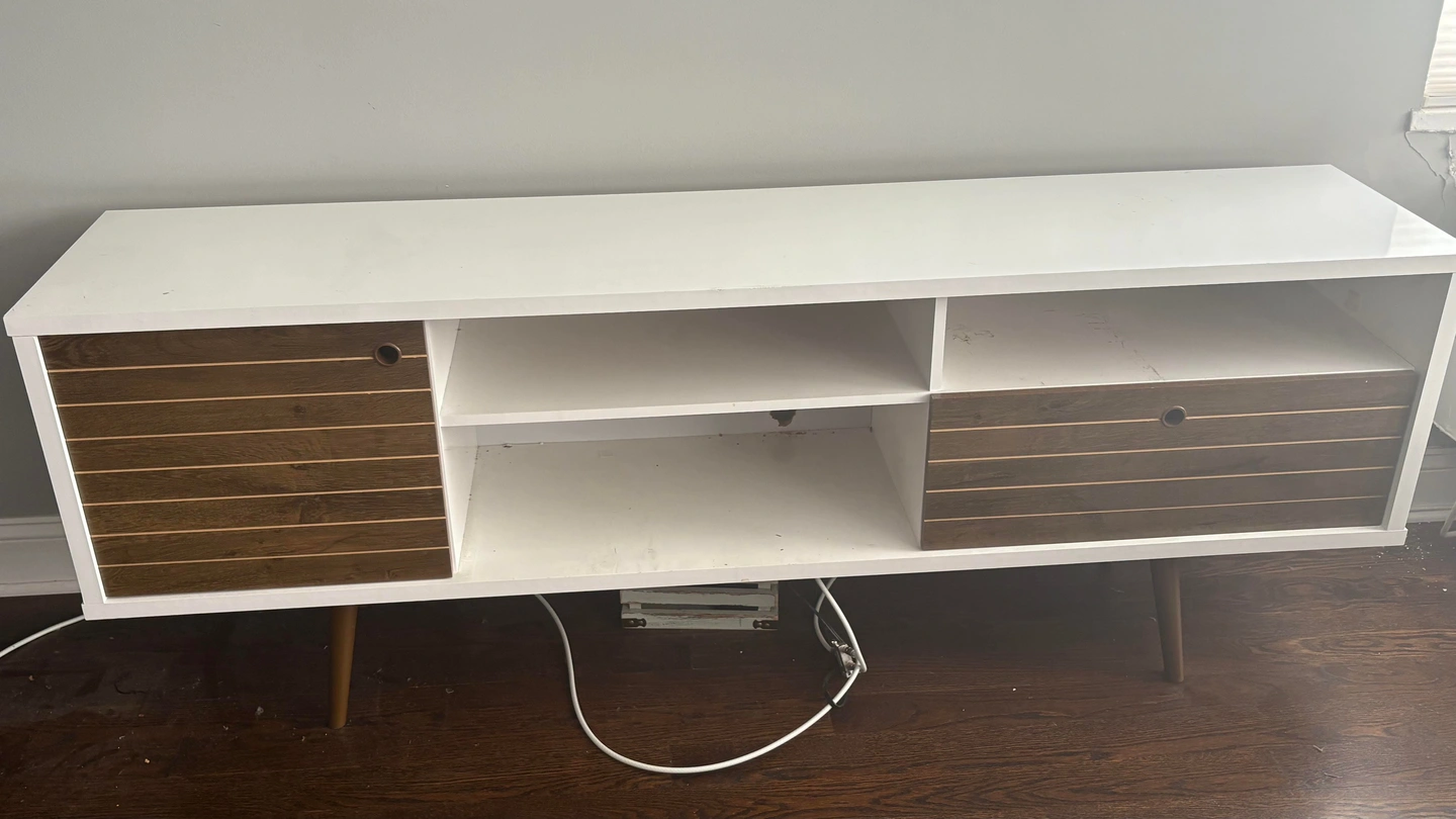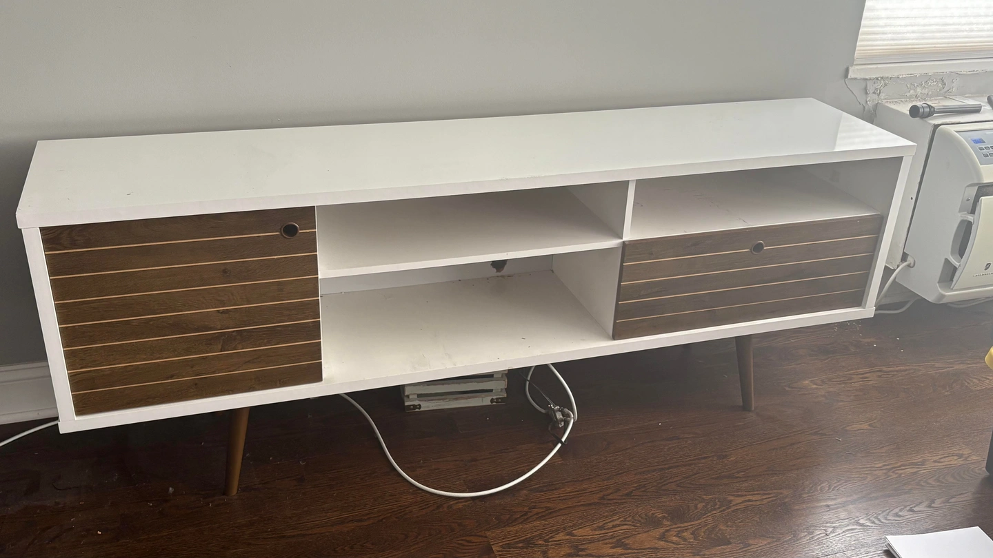 can be used as a credenza. Has a doored shelf, drawer and 3 open storage spaces. Can handle a 70" TV. Priced for quick sale. It is just 4 years old and cost $219 new.