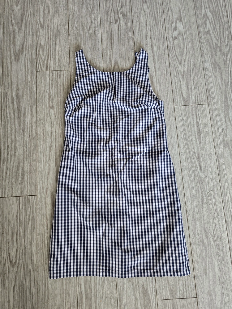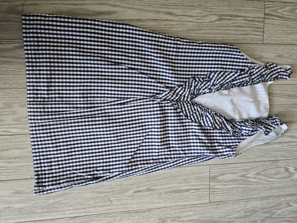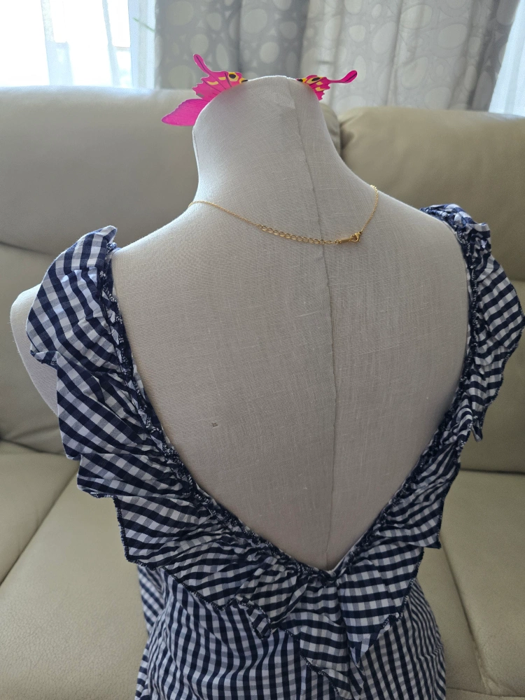 Cute gingham dress in navy and white! It's in great condition and perfect for summer. The dress has a ruffled trim and a comfortable lining. Low back perfect for summer