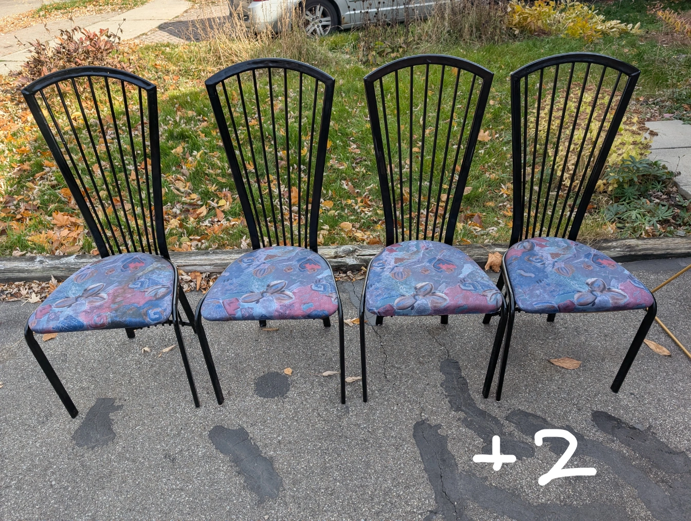 Selling a set of six dining chairs. They feature a unique black metal frame and a retro, floral patterned fabric seat. These chairs would be a great addition to any dining room or kitchen!