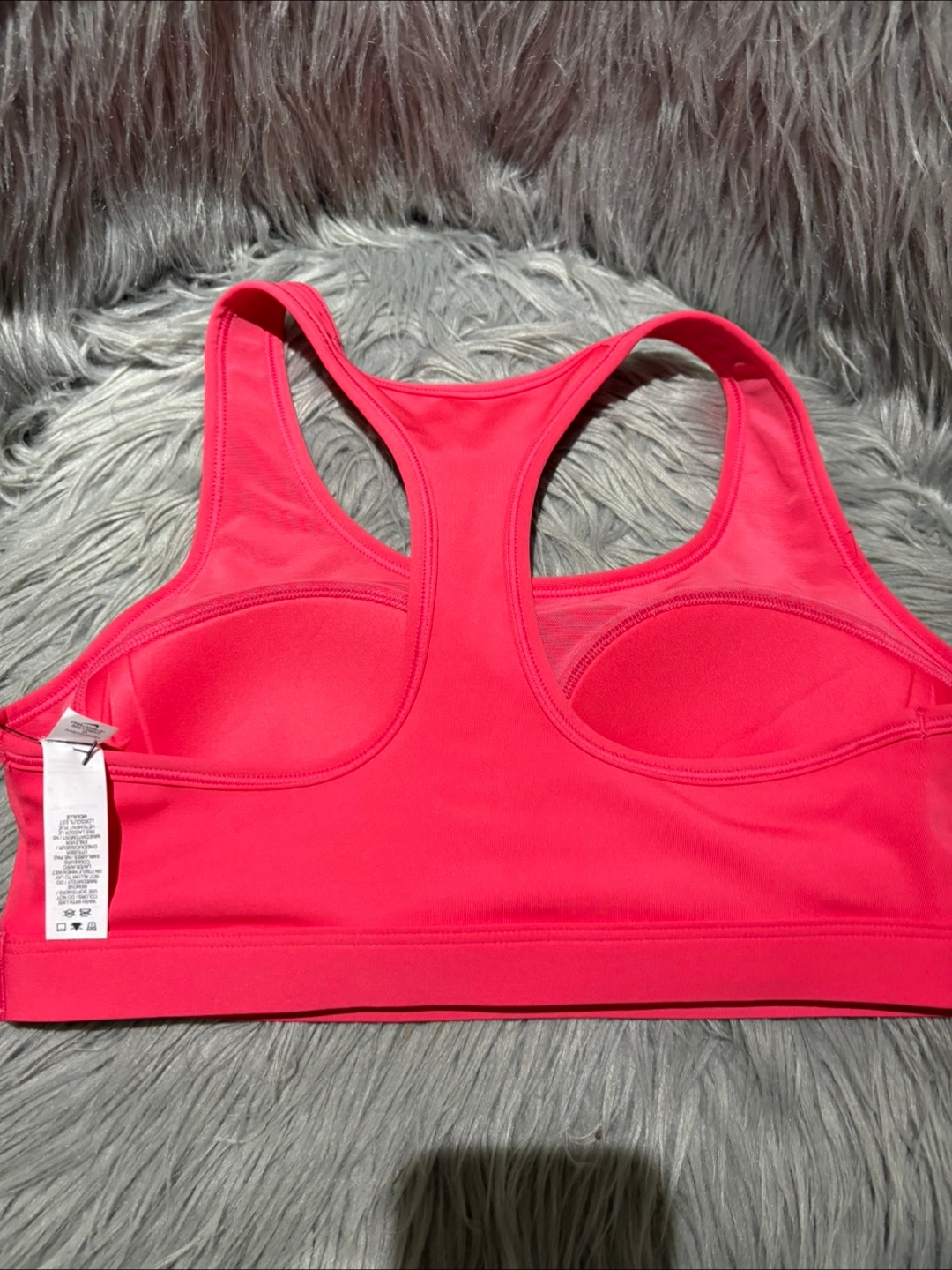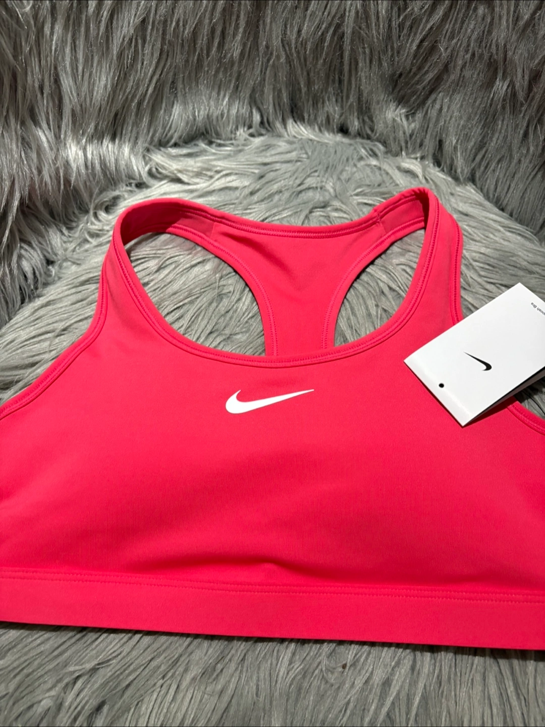 I'm selling a Nike women's training sports bra in size medium. It's a vibrant pink colour and features Nike's Dri-FIT technology. The tag shows it was originally CAD $48. Great for workouts!