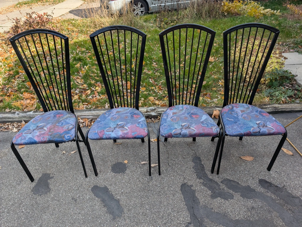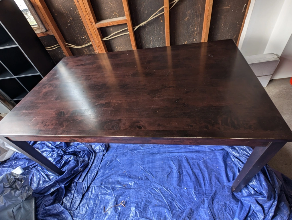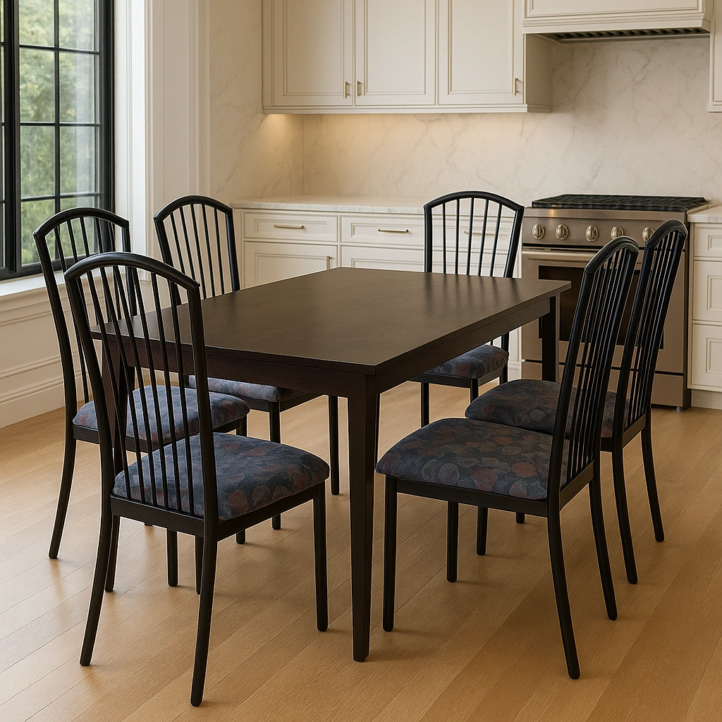 Selling a dining table with six chairs. The table is a dark wood colour, and the chairs have a unique floral pattern on the seats. It's a great set for family dinners or entertaining guests!