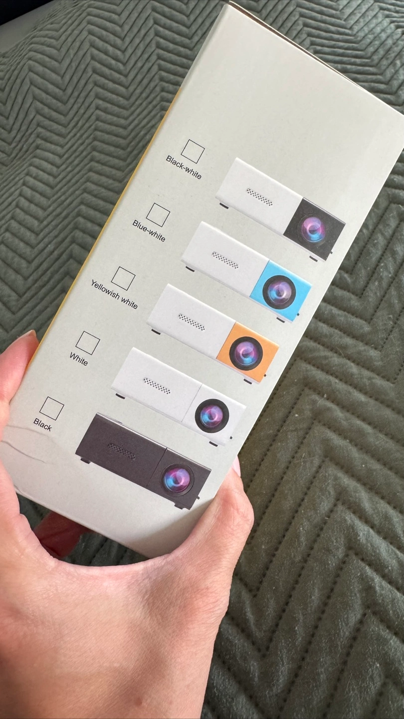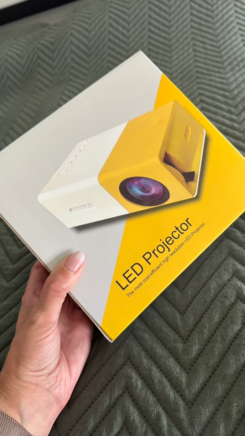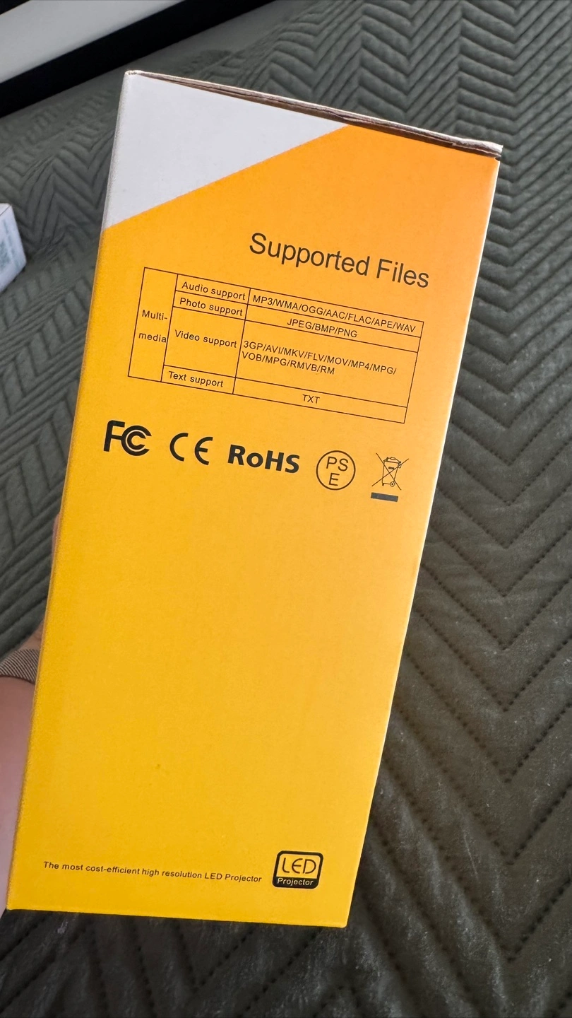 Selling an LED projector in yellowish white! The box shows it supports various audio, photo, video, and text file formats. It's a most cost-efficient high resolution LED projector. Box included