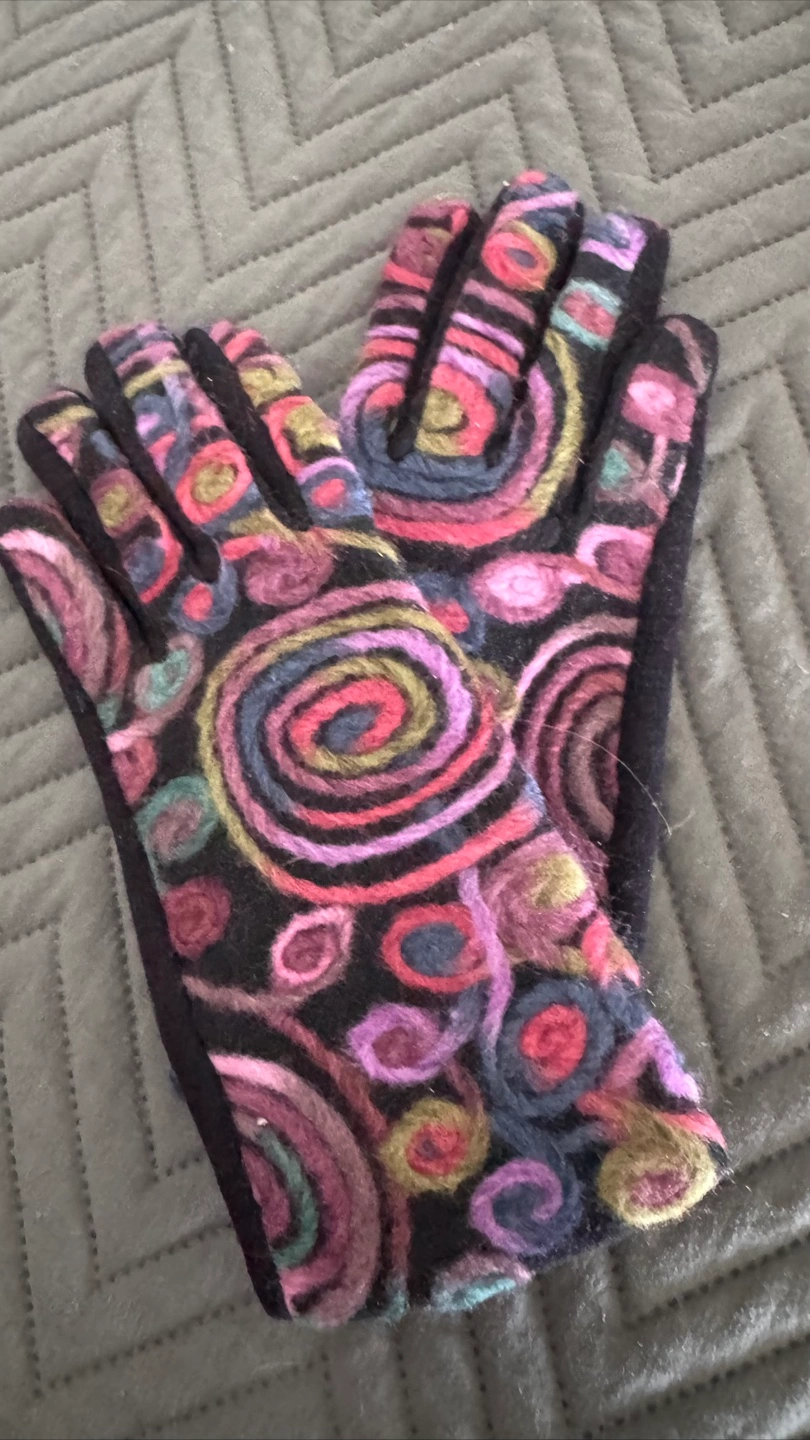 Keep your hands warm and connected with these touchscreen compatible gloves! They feature a colourful, swirly design on a black background. One size fits most.