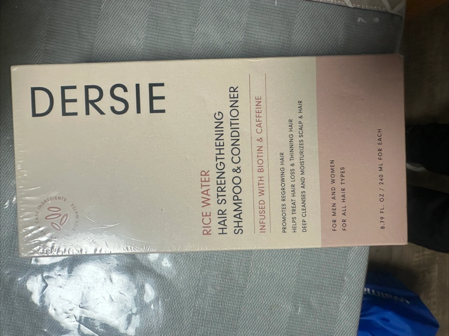 This is a new Dersie Rice Water Hair Strengthening Shampoo & Conditioner set. It's infused with biotin and caffeine to promote regrowing hair, helps treat hair loss, and moisturizes the scalp. It's for both men and women and for all hair types. Each bottle contains 240 mL.