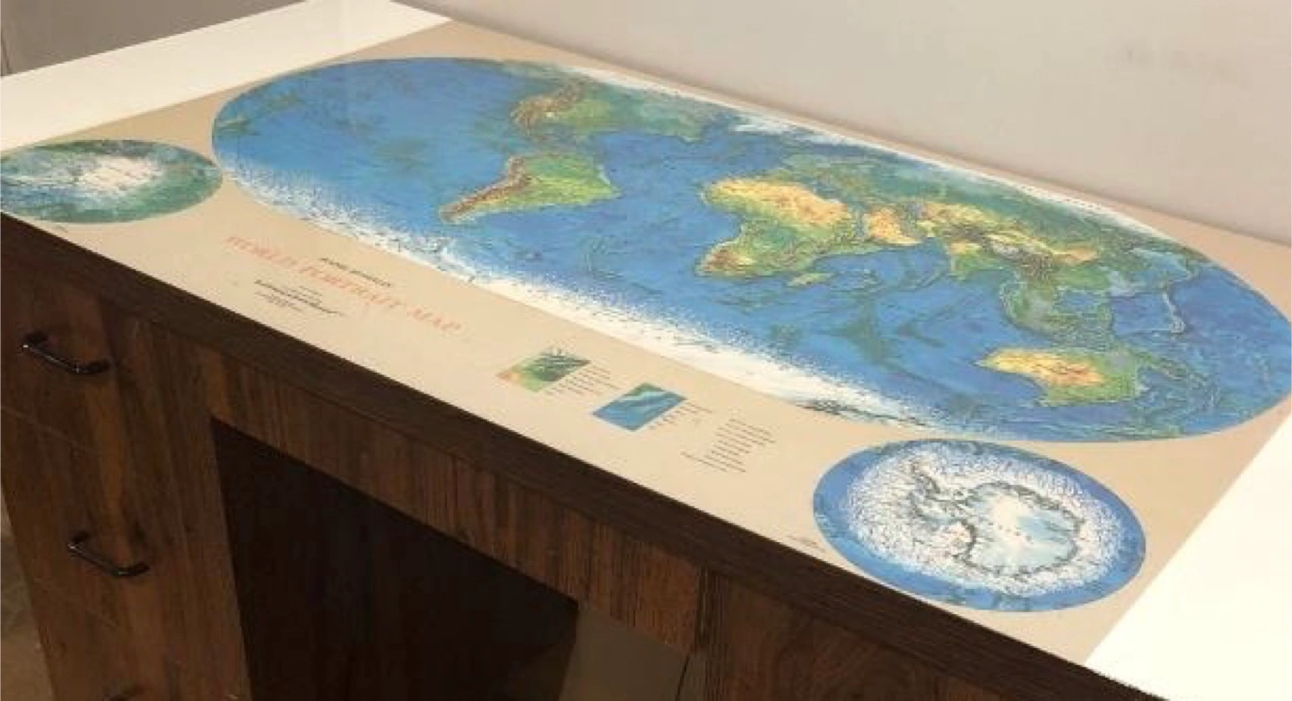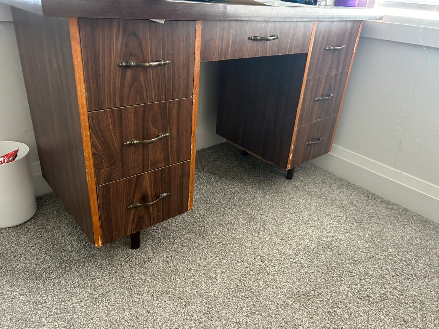 Selling a vintage desk with a unique woodgrain finish and a world map design on the top surface. It features multiple drawers for storage. A great piece for a home office or study! 47.5”l x 23.5”w x 29.5h