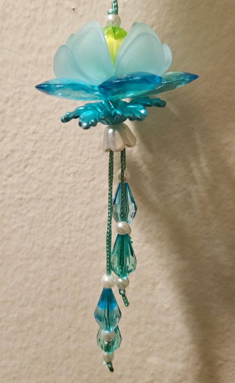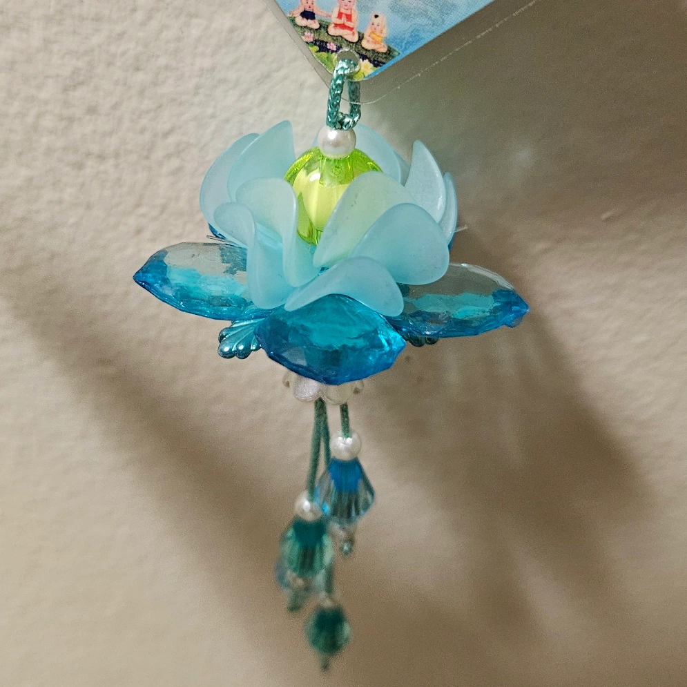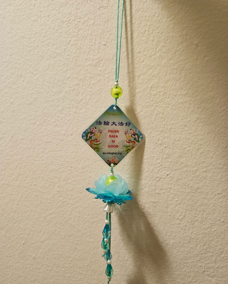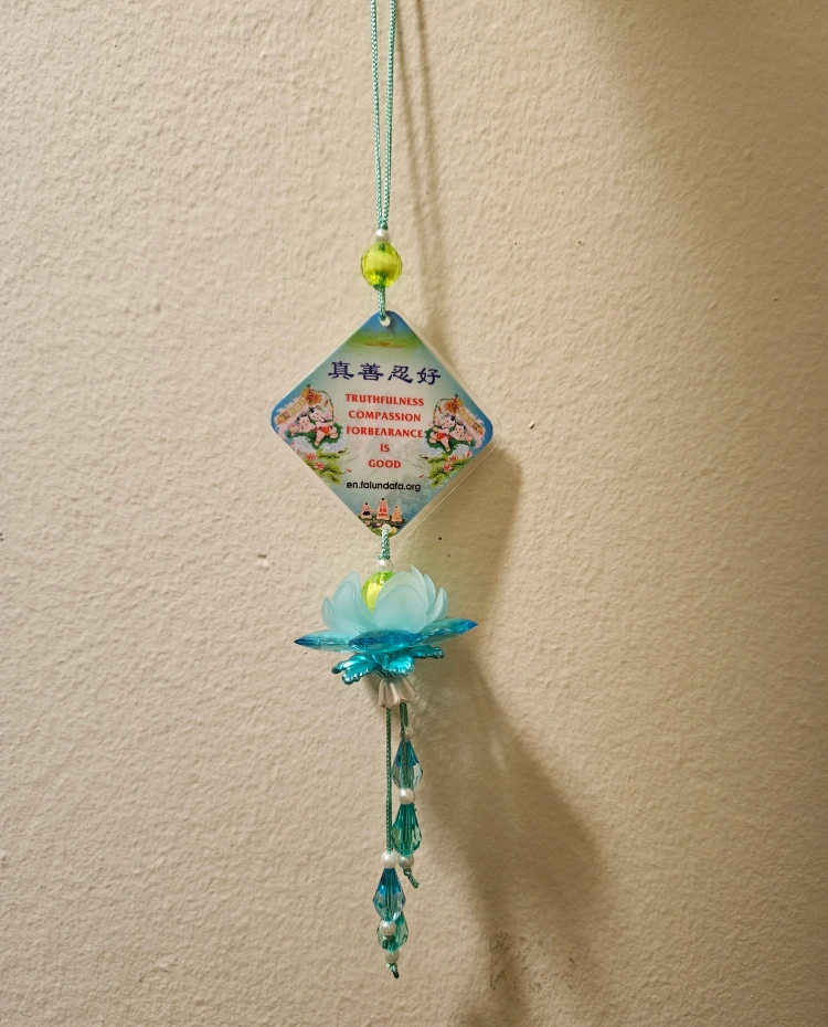 This is a Falun Dafa ornament with a lotus flower design and beads. It features the words Truthfulness, Compassion, Forbearance and Good.