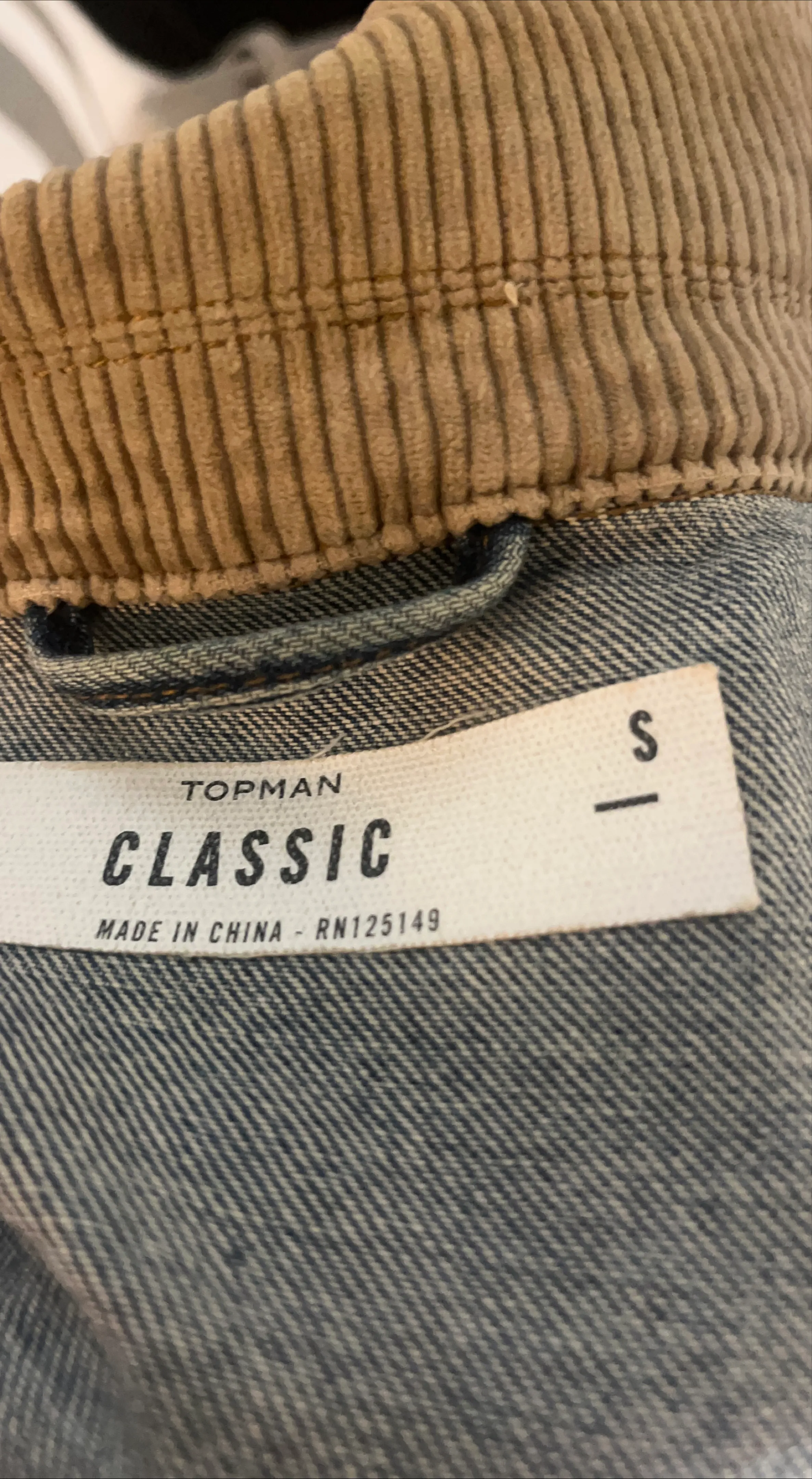 Here's a Topman Classic denim jacket up for grabs! It's a size small and features a classic denim look with a corduroy collar. Perfect for layering or wearing on its own!