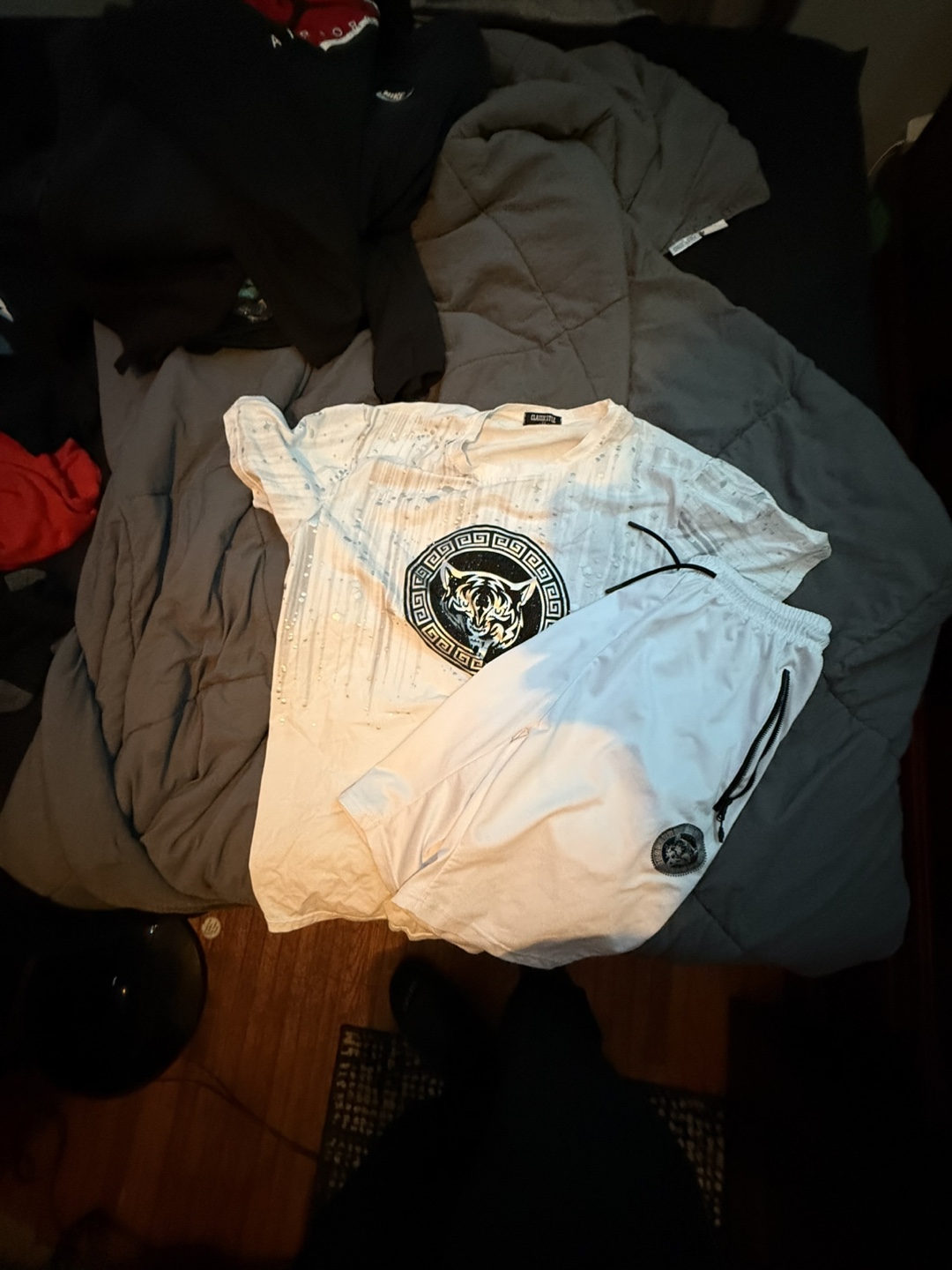 Selling a matching white t-shirt and shorts set from Gladiator! The shirt has a cool tiger design on the front, and the shorts have a matching logo. Perfect for casual wear or lounging around