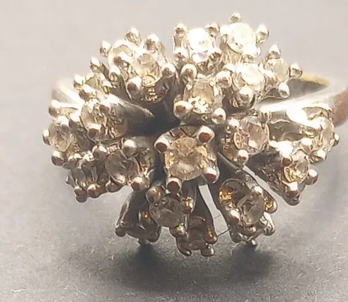 Selling a vintage silver-tone cocktail ring. It features a unique design with multiple small stones, perfect for adding a touch of sparkle to any outfit! The ring is in good condition and ready for a new home