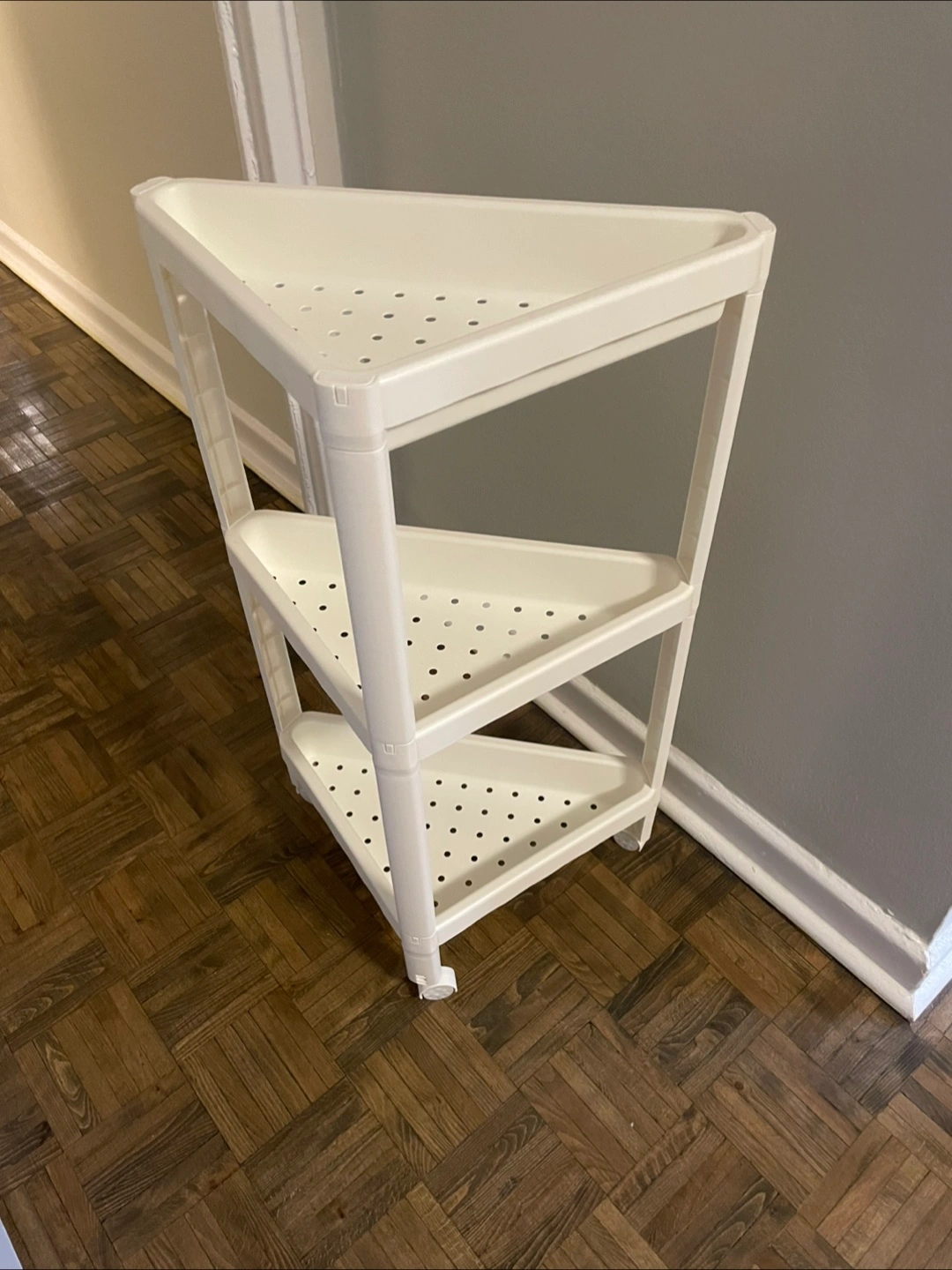 Selling a handy white corner shelf unit! It's perfect for adding some extra storage in a small space. This shelf is in great shape and ready for a new home