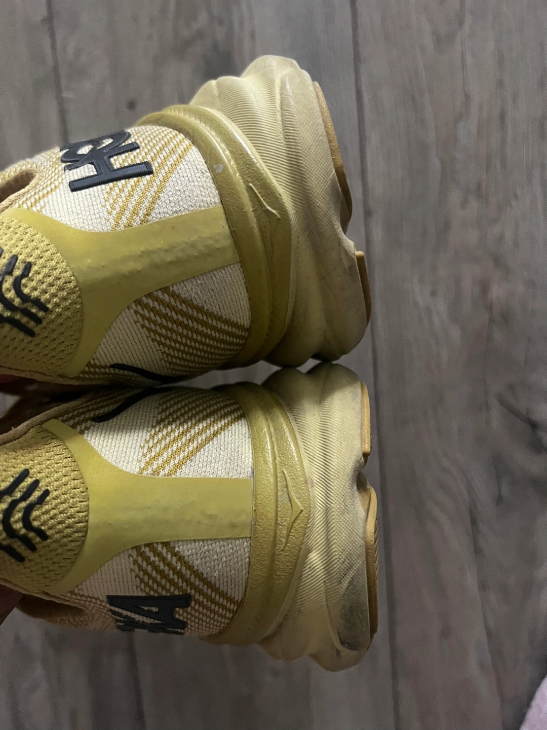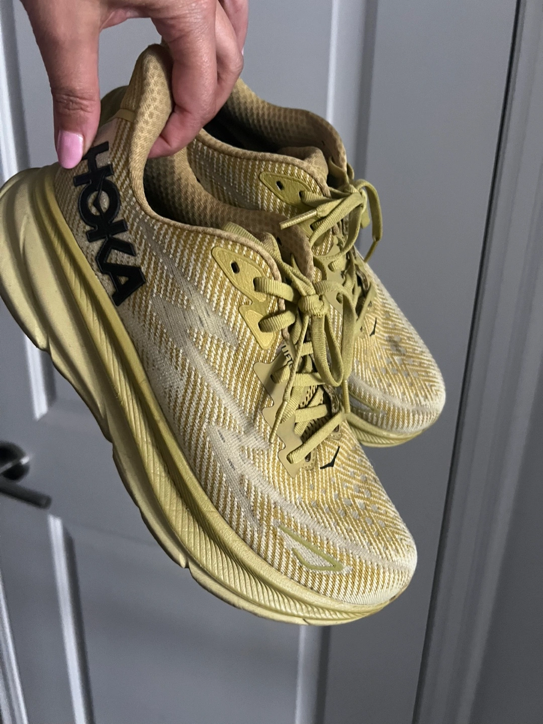 Hoka running shoes size 9.5 women or 8 men. Lightly worn but just not my style. Small mark on one shoe will easily come out in the wash.