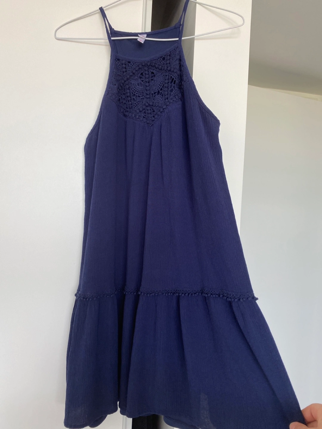 Selling a cute dress in navy blue. It's a lovely summer dress, perfect for warm weather! The dress has a halter neckline and a tiered skirt. Great condition!