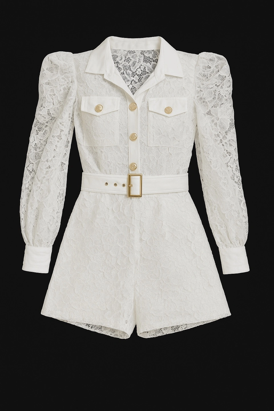 Step into timeless elegance with this stunning white lace romper, perfect for any stylish occasion. Featuring exquisite floral lace detailing, gold-tone statement buttons, and a flattering tailored fit, this piece blends vintage charm with modern sophistication. The structured collar, puffed sleeves, and adjustable belt enhance the silhouette, offering both comfort and confidence.