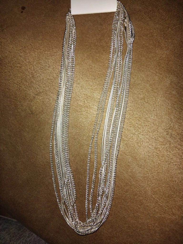 Here's a stylish silver-tone multi-strand chain necklace! It's perfect for adding a touch of shine to any outfit