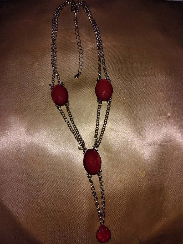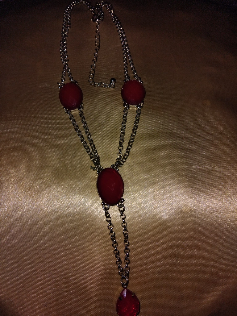 A lovely red stone necklace! It features a silver-tone chain with red stones. Perfect for adding a pop of colour to any outfit!