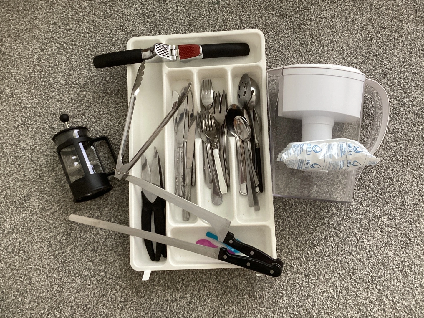 Selling a Brita water filter pitcher with a new filter, and a variety of kitchen utensils including tongs, a garlic press, and cutlery ( without the tray). All in good condition and ready for a new home!