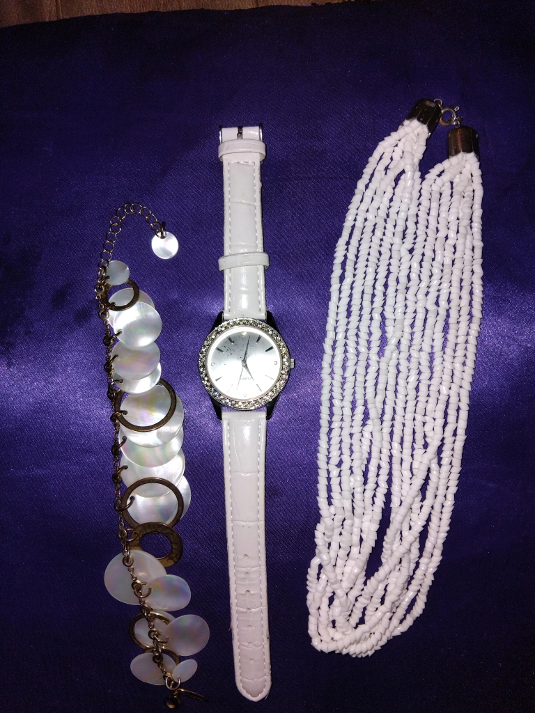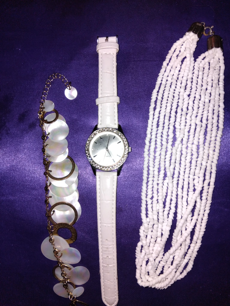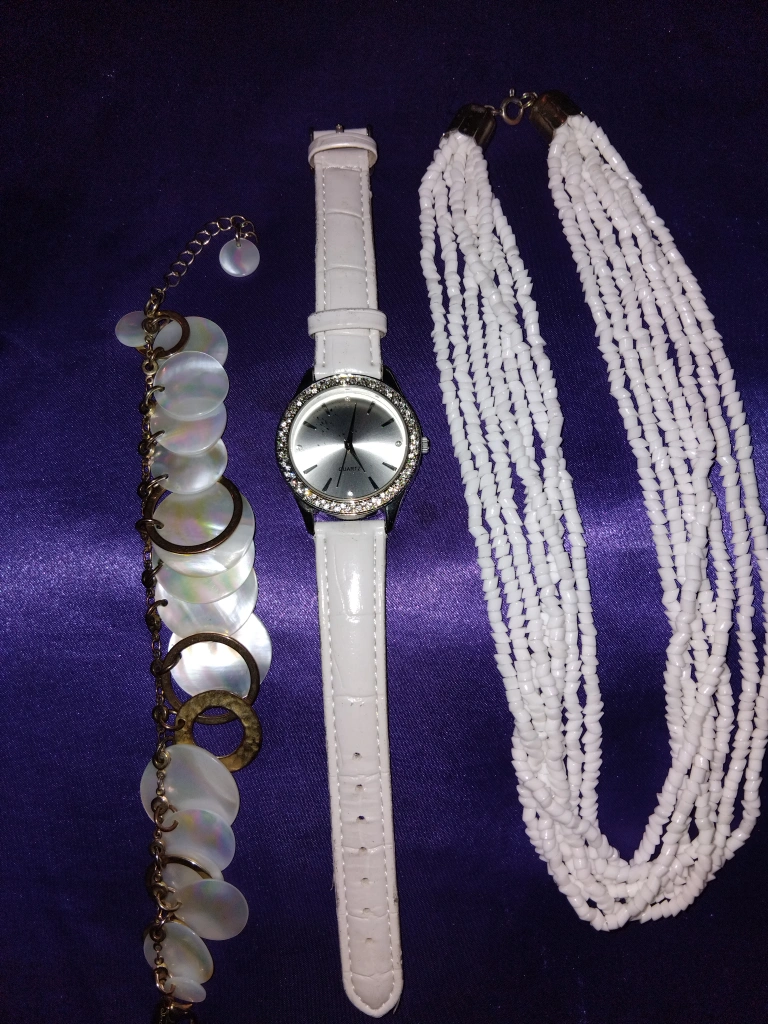 Selling a watch and necklace set. The watch has a white band and the necklace is a multi-strand white beaded design. Also included is a bracelet with shell-like accents