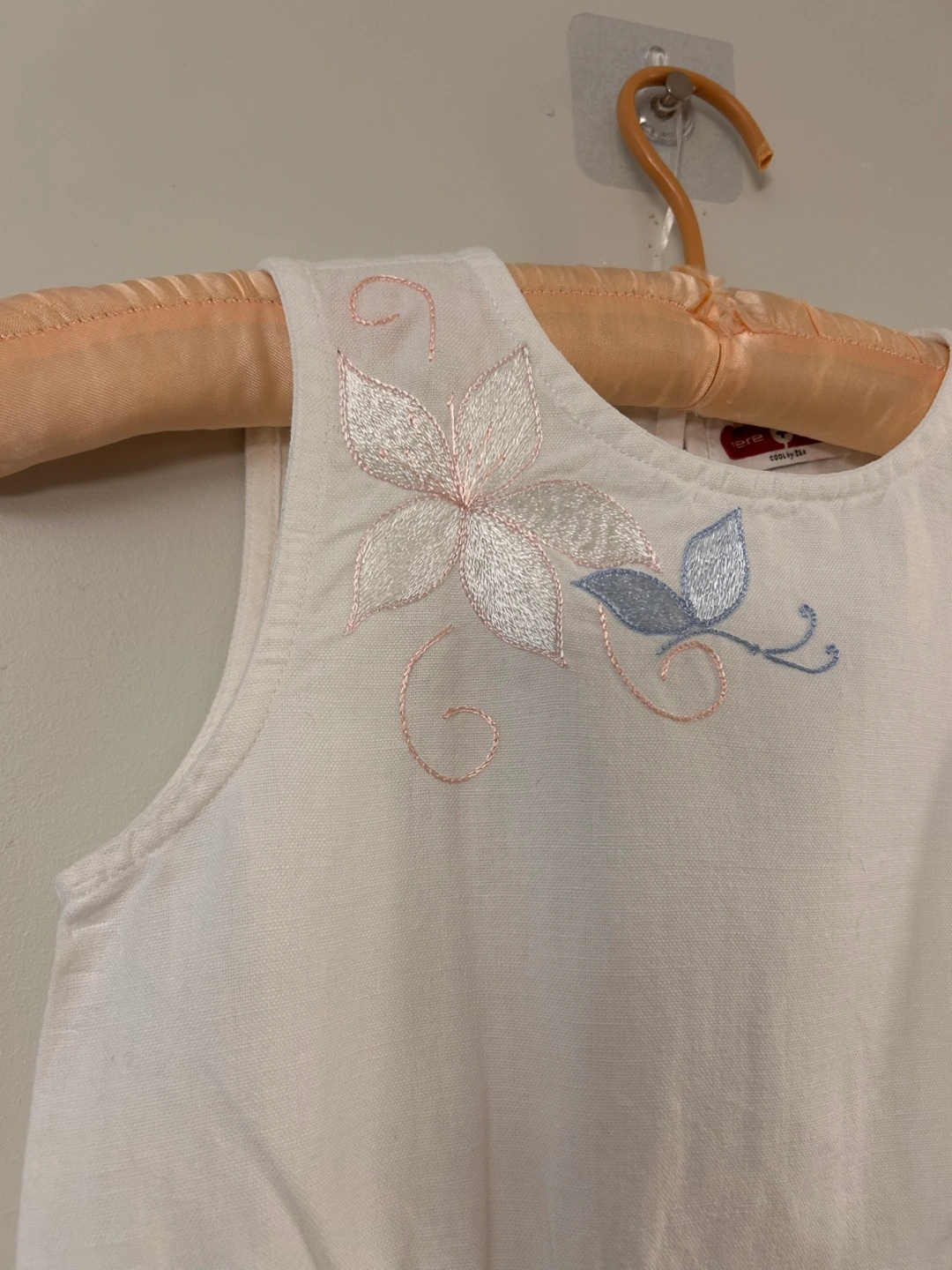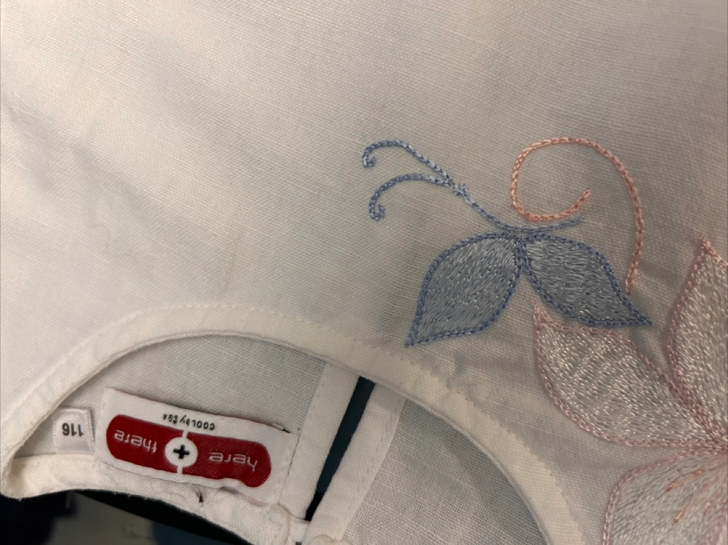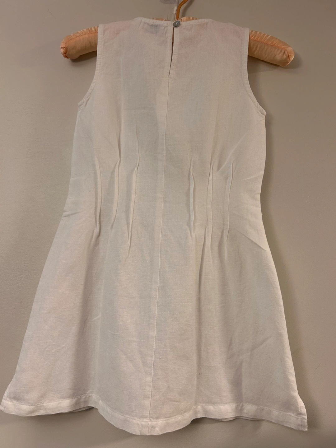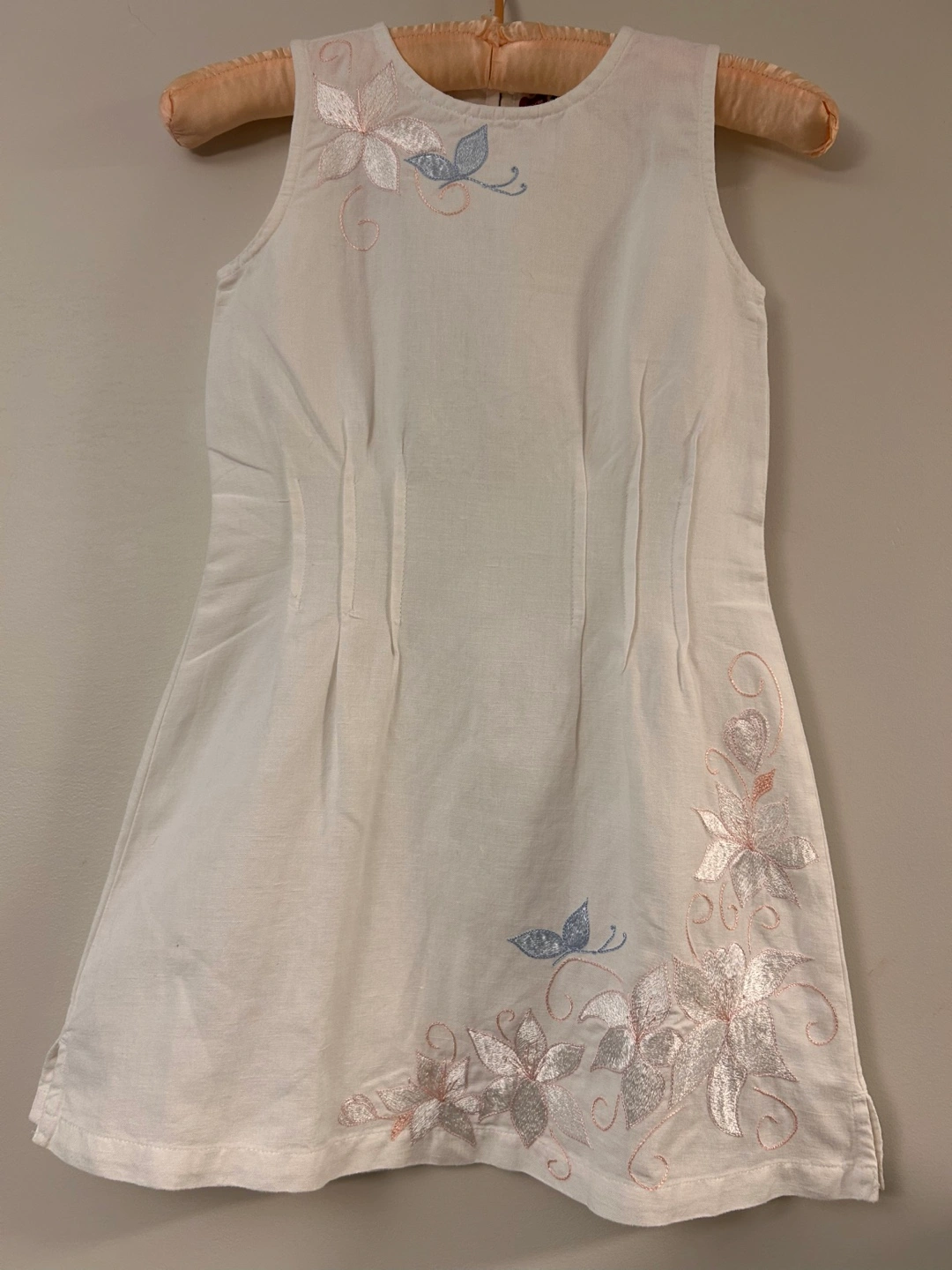 Вишиване плаття моєї донечки (привезли з України). Вишивка ручної роботи , шовковими нитками та в єдиному екземплярі (в живу - кольори менш насичені). Орієнтовно, на дівчинку зростом 110-130см (залежить від тіло будови / орієнтуйтесь на заміри, що є на фото). Я сукню купляла в Європі , а потім українська майстриня на замовлення вишивала лілії вручну . Якісна сукня білого кольору , стильного фасону, дуже елегантно виглядає. Донечка одягала буквально кілька разів. Склад: 57% льон ; 43% бавовна (матеріал не тягнеться).