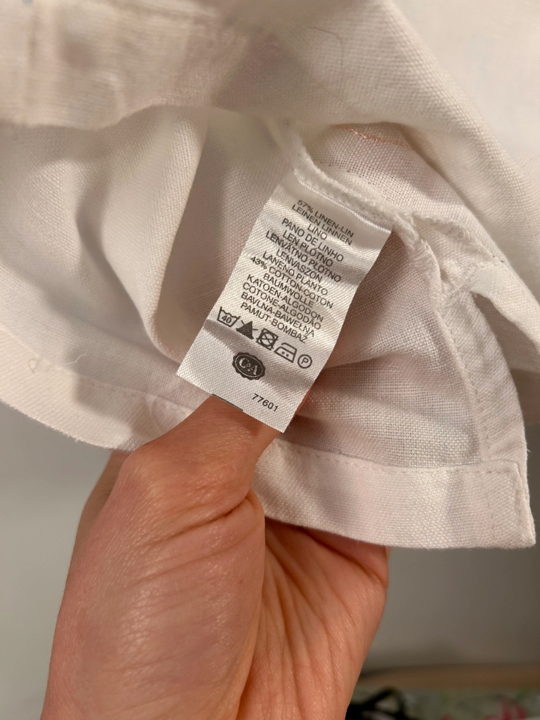 Made from high-quality white fabric – 57% linen / 43% cotton (non-stretch). Stylish and elegant cut.