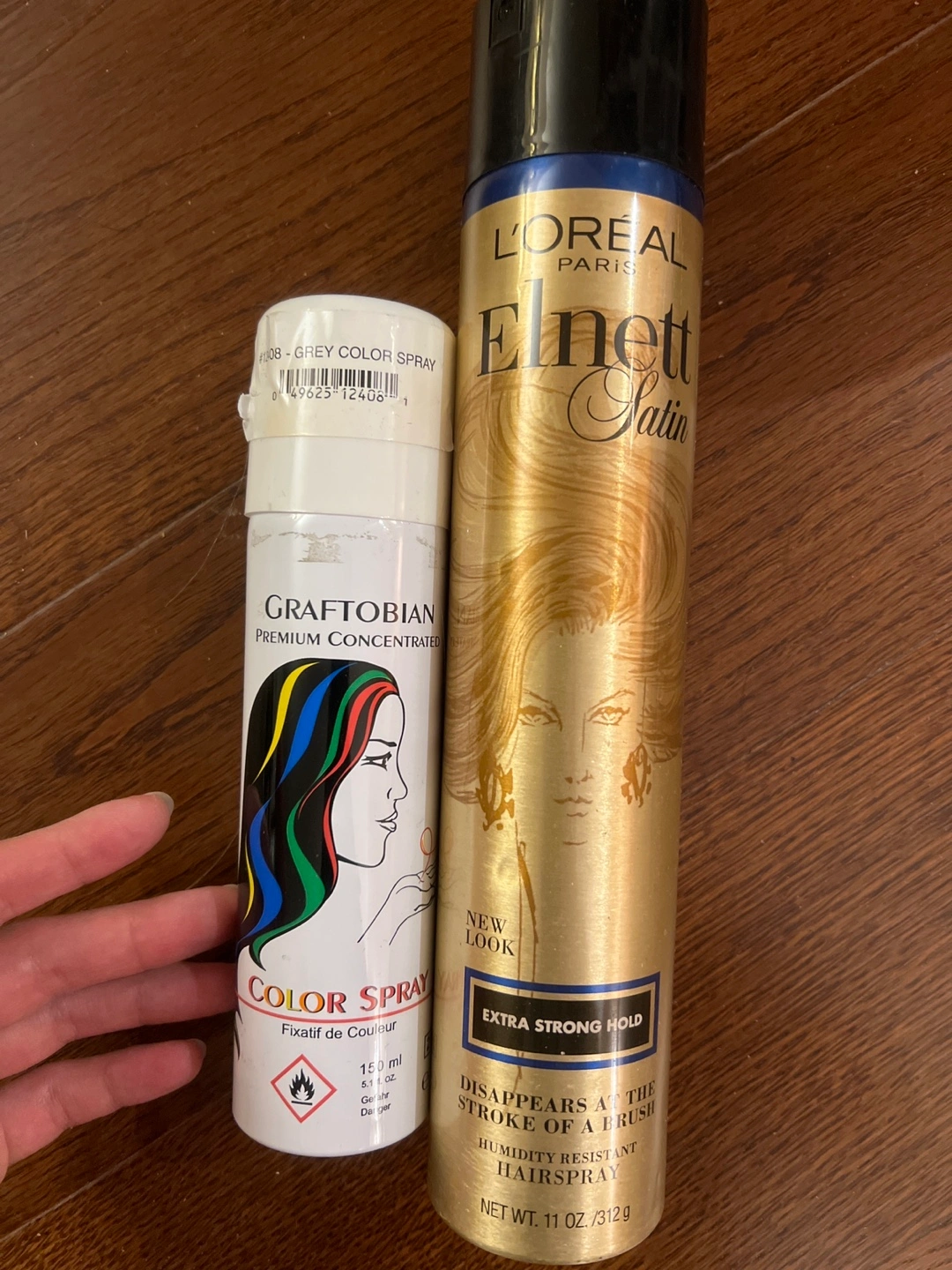 Selling two hair styling products: a can of L'Oreal Elnett Satin Extra Strong Hold Hairspray and a can of Graftobian Premium Concentrated Color Spray. The L'Oreal hairspray is humidity resistant and disappears at the stroke of a brush. The Graftobian color spray is grey.
