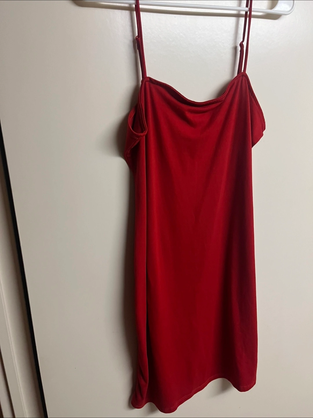 A cute red mini cami dress! Perfect for a night out or just lounging around at home.