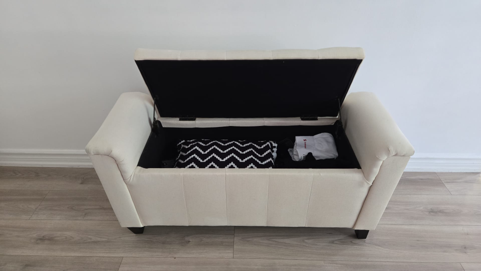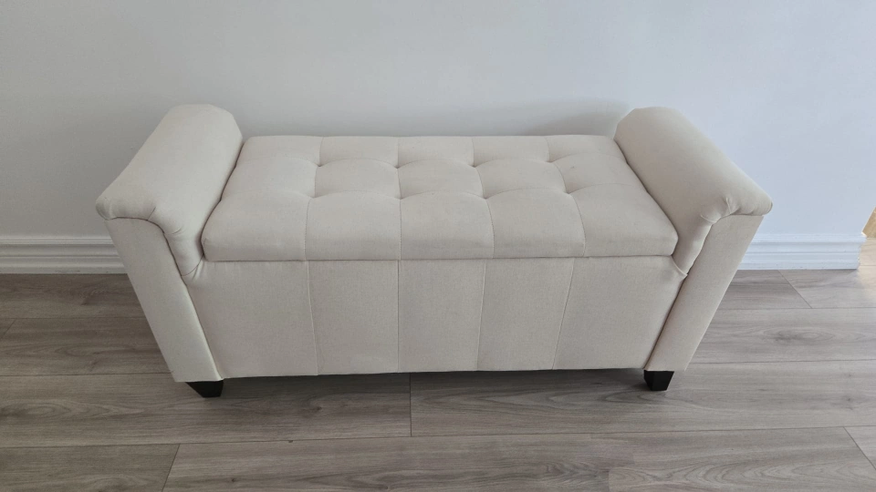 Selling a storage ottoman bench in a neutral colour. It's in great condition and perfect for adding extra seating and storage to any room. The ottoman has a lift-up top, revealing a spacious storage compartment inside. Great for storing blankets, pillows, or other household items! Perfect for any living room or bedroom