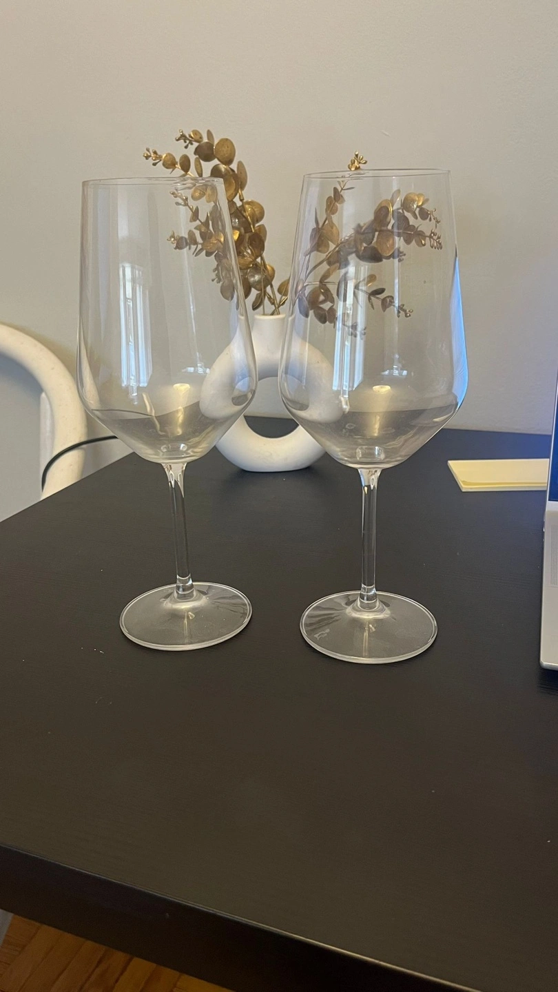 Selling a set of two wine glasses. They have a delicate gold leaf design on the top half of the glass. Perfect for entertaining or adding a touch of elegance to your dining table!