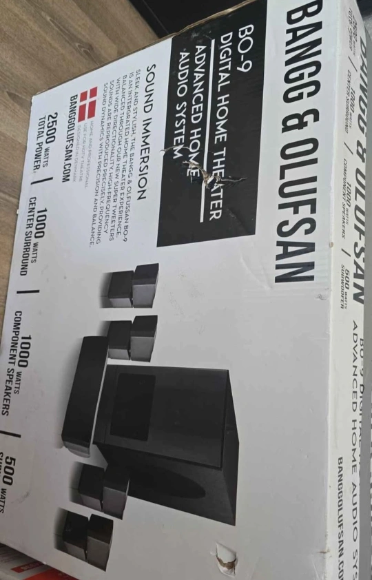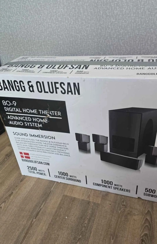 Selling a Bang & Olufsen BO-9 digital home theatre audio system. It delivers sound immersion for a new audio experience. Sleek and stylish, this system is designed for both home and professional use. The total power is 2500 watts, with 1000 watts for the center surround and 1000 watts for the component speakers, plus 500 watts for the subwoofer. The box is included!