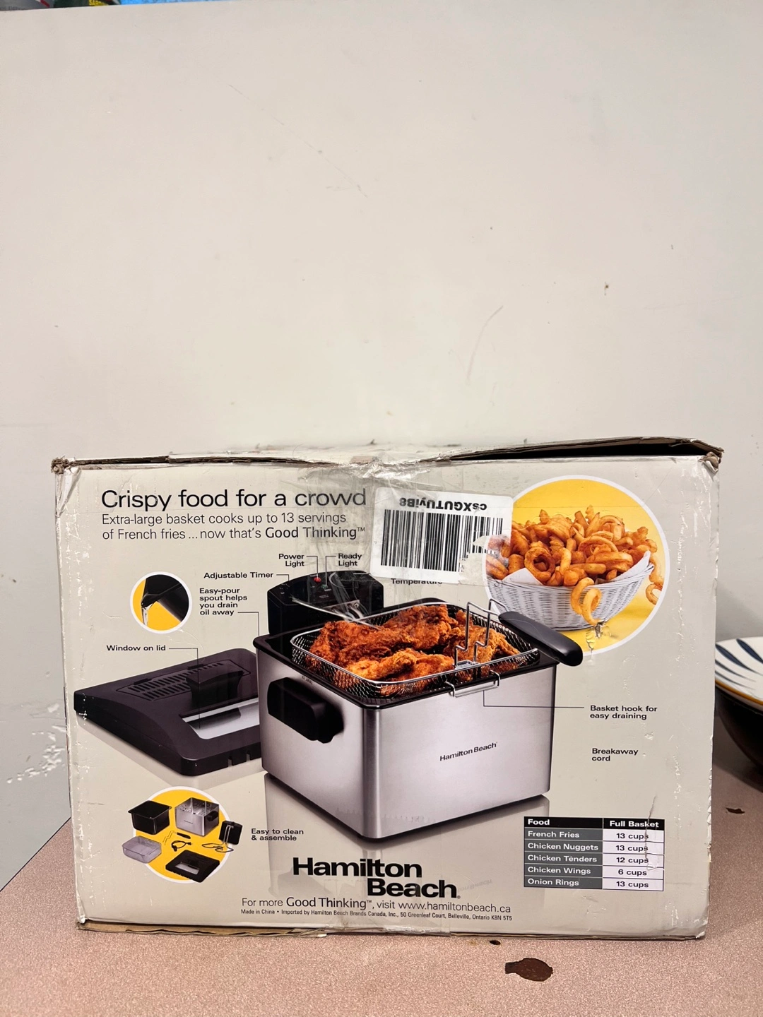 Product is in new condition, no scratches and dents whatsoever. Just missing the frying basket which can be bought for 5$ elsewhere. Box was opened just to check the contents inside. Never used.