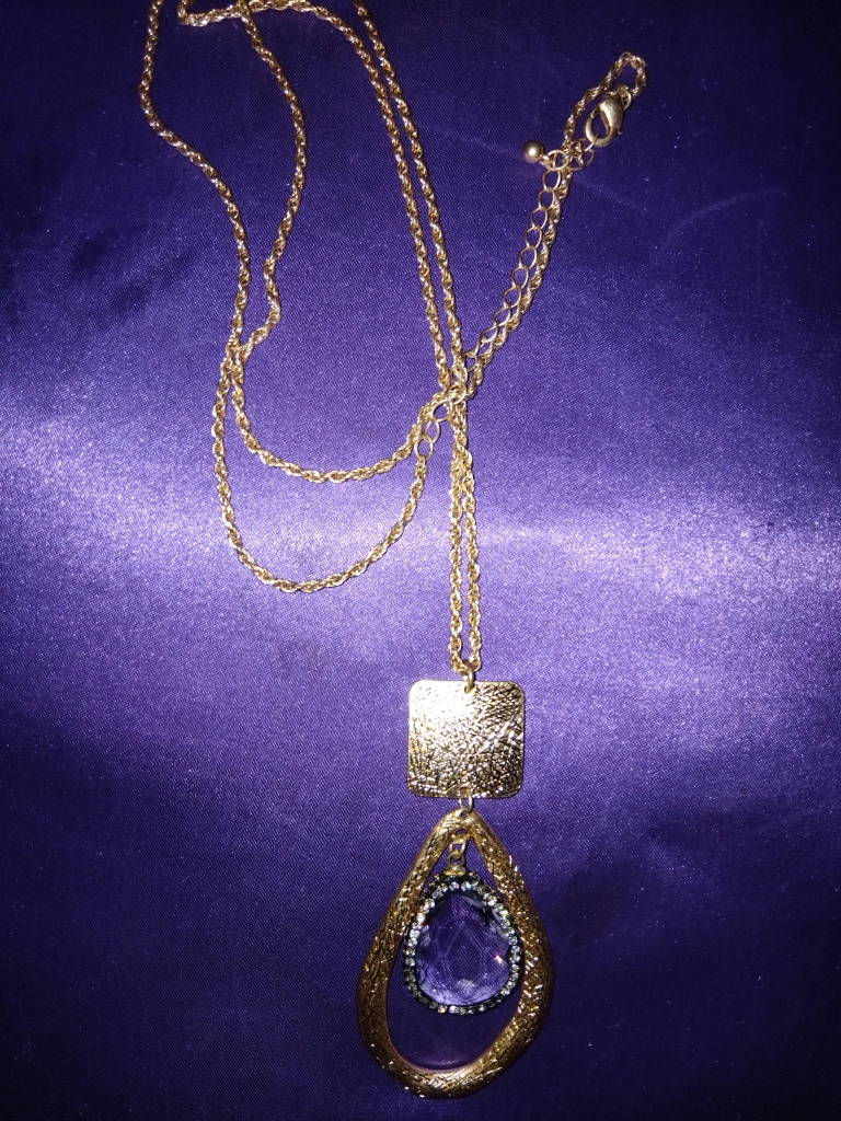 A lovely gold-tone necklace featuring a unique pendant with a textured square and a teardrop shape surrounding a purple stone. It's a stylish piece to add some flair to any outfit