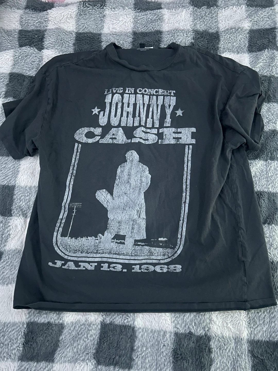 This s/p black t-shirt features a graphic from Johnny Cash's live concert on January 13, 1968. It's made from a comfortable material. This tee is perfect for fans of country music and Johnny Cash's iconic legacy.