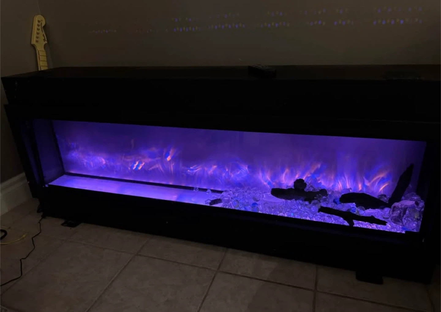 This is a black electric fireplace. It has a realistic LED flame effect with multiple colour options, including purple and orange. The fireplace comes with decorative logs and glass crystals for the hearth. It's a great way to add ambiance to any room!