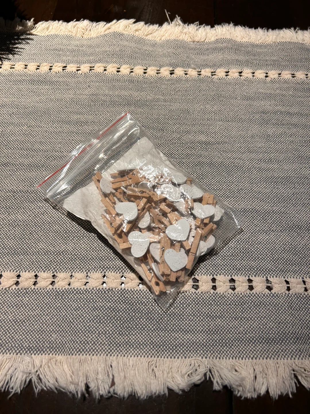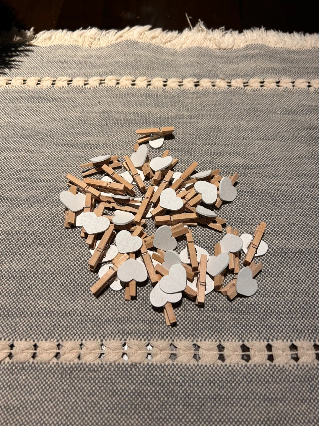 These are mini wooden clothespins decorated with a white heart shape. They're great for crafts, hanging photos, or decorating cards. A bag of 38 pieces is included.