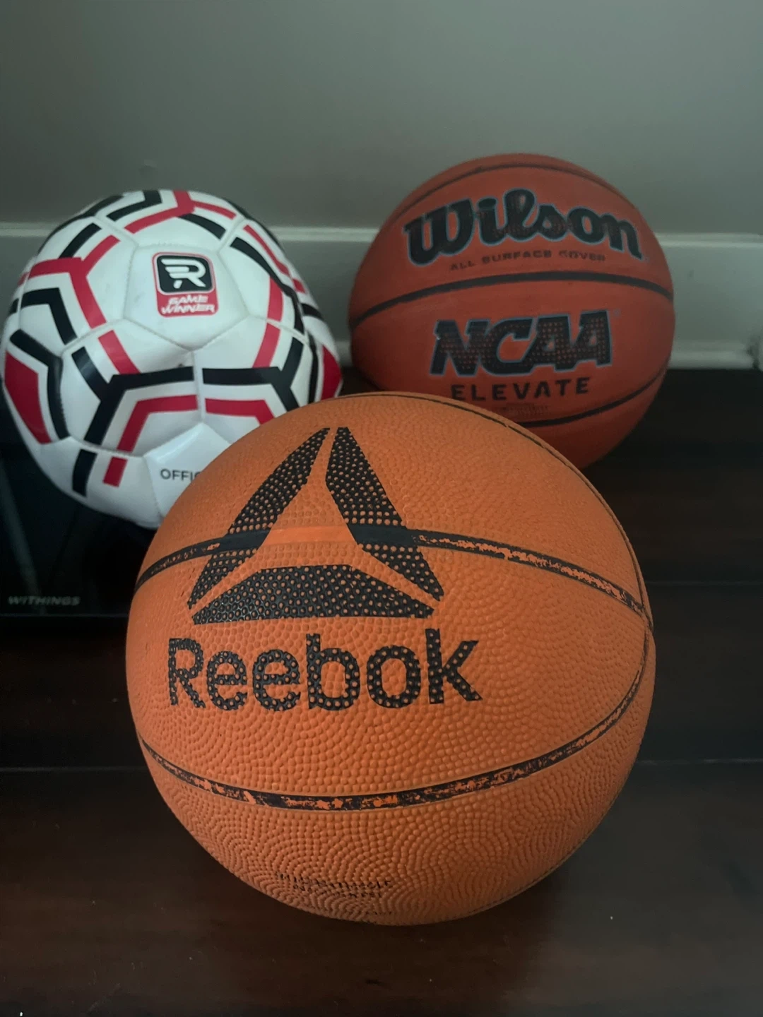 This listing includes a Wilson NCAA Elevate basketball and a Reebok basketball. Both are standard orange basketballs. The Wilson ball is suitable for all surfaces. A white, red, and black soccer ball is also included. Its brand is 'Game Winner'.