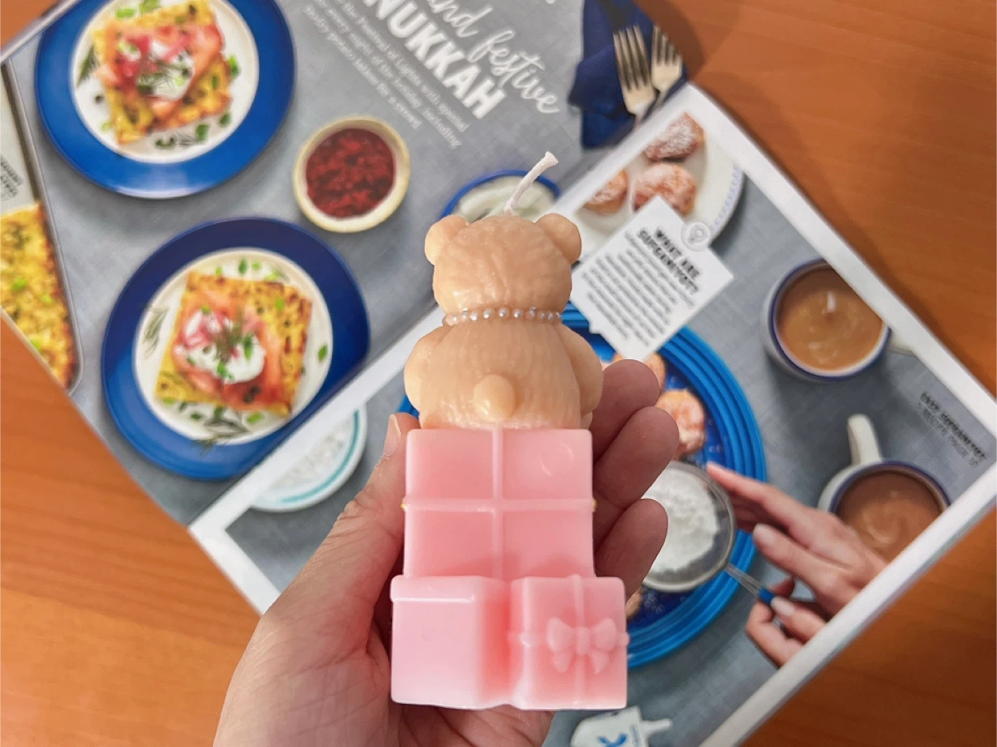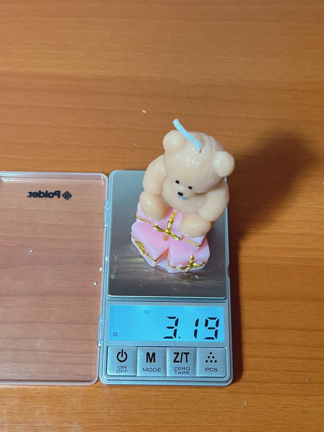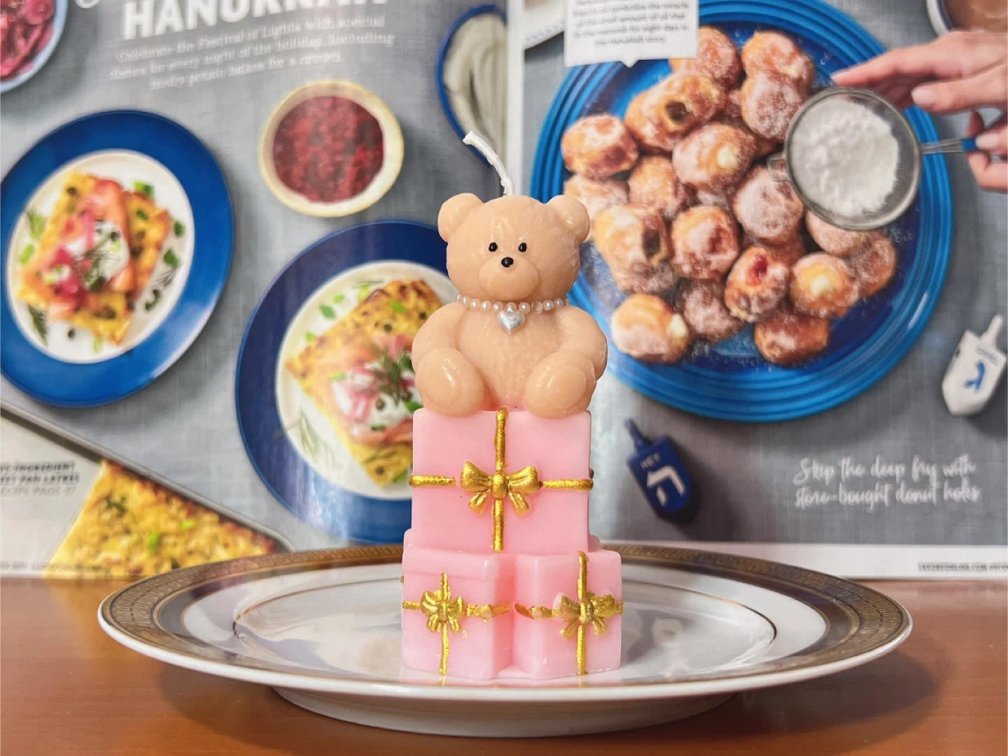 Cute teddy bear candle sitting on stacked pink gift boxes with gold ribbon accents. Perfect for Hanukkah or as a charming decorative piece. Measures 3.19 oz on scale.