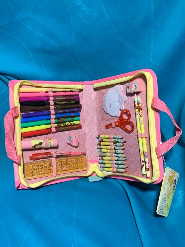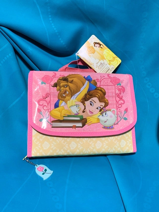 This is a new Disney Beauty and the Beast zip-up pencil case, perfect for keeping your little one's stationery organized in style. Featuring Belle and the Beast, this case is not only functional but also adds a touch of fairytale magic to their school supplies. This is a brand new pencil case, never used. It comes complete with markers, pencil crayons, scissors, a ruler and more! See images for details. A classic Disney Store item with original store tags on it. If the ad is still up, the pencil case is still available!