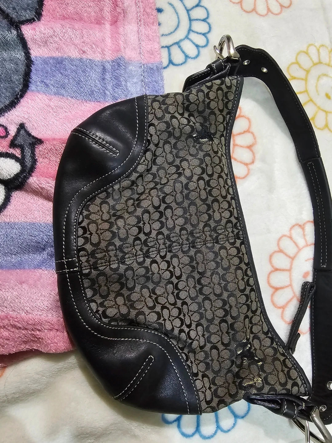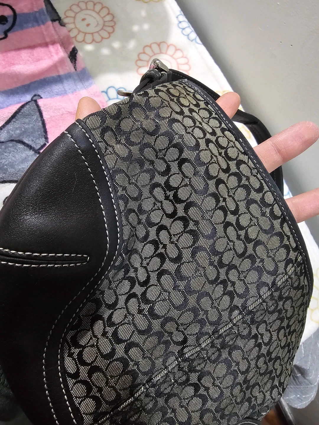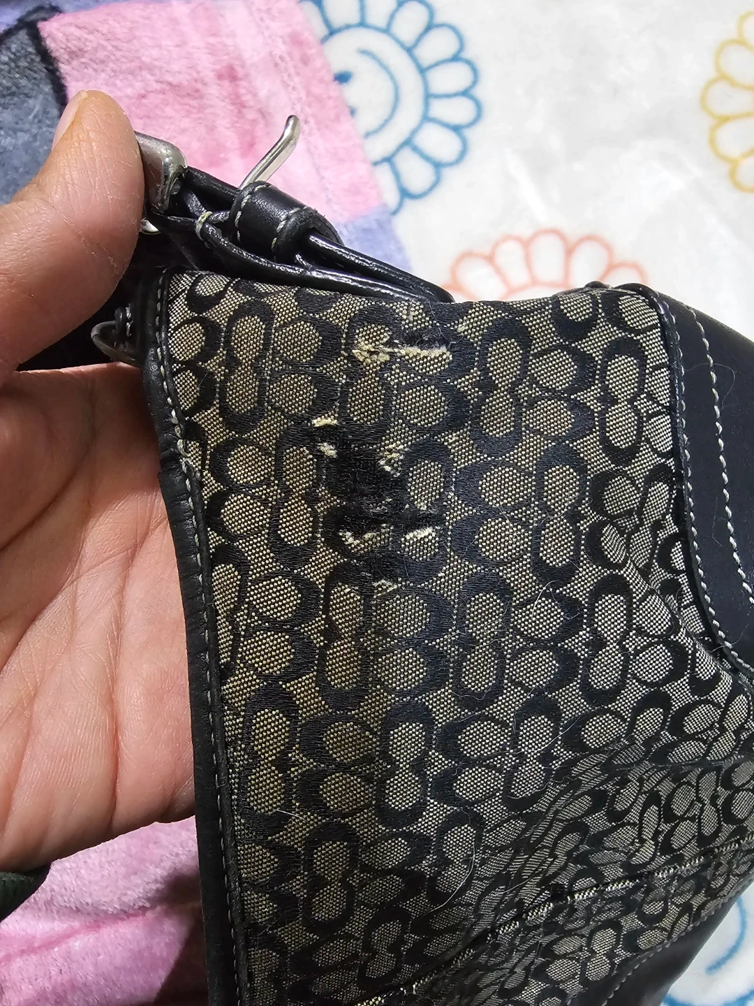 This is a Coach shoulder bag with the signature monogram pattern. It's made from coated canvas and leather trim. The bag features a single strap and a zip-top closure. This bag is fair ( wear on it ) Please zoom in the photos Pick up in queens 11369