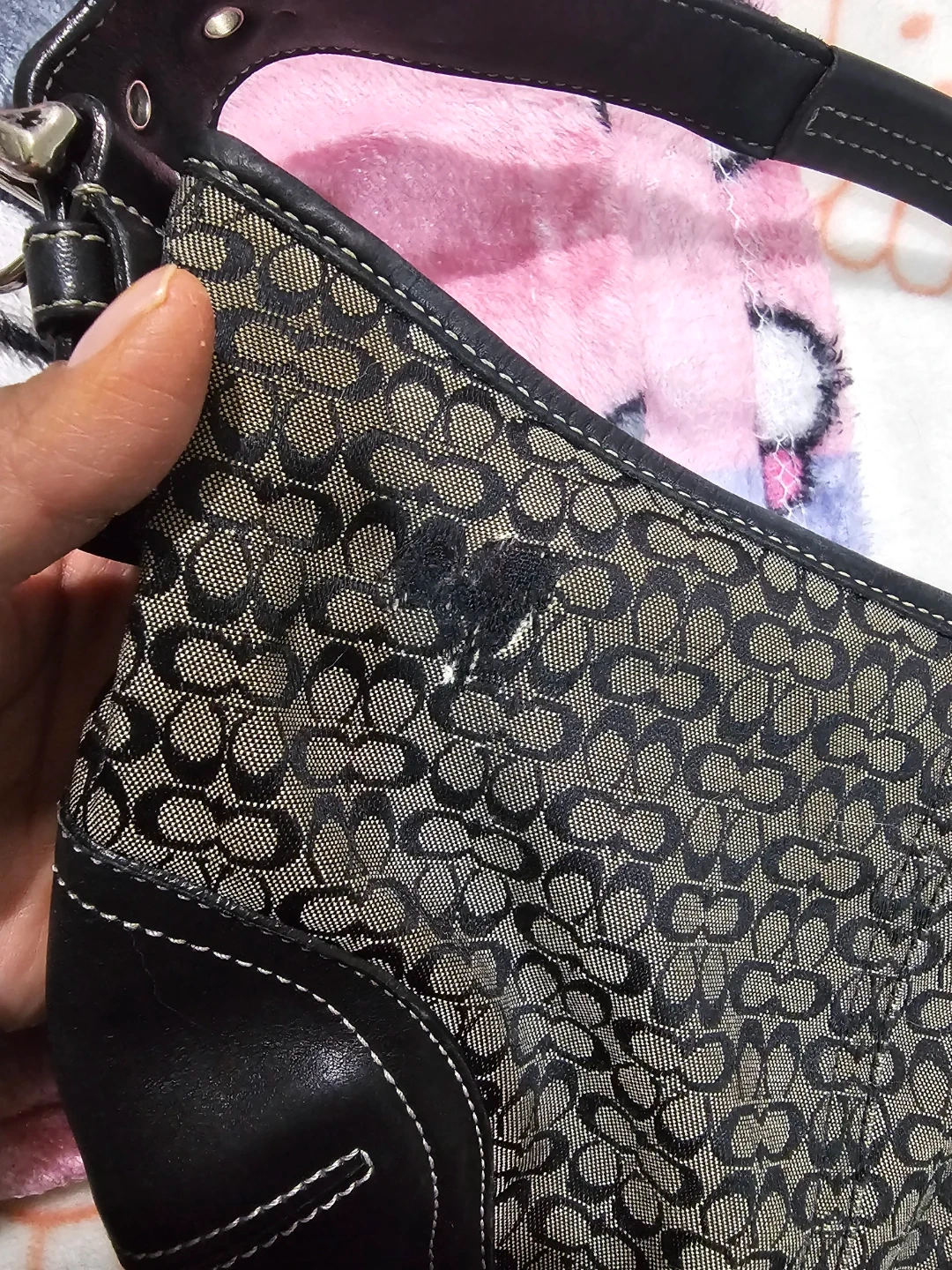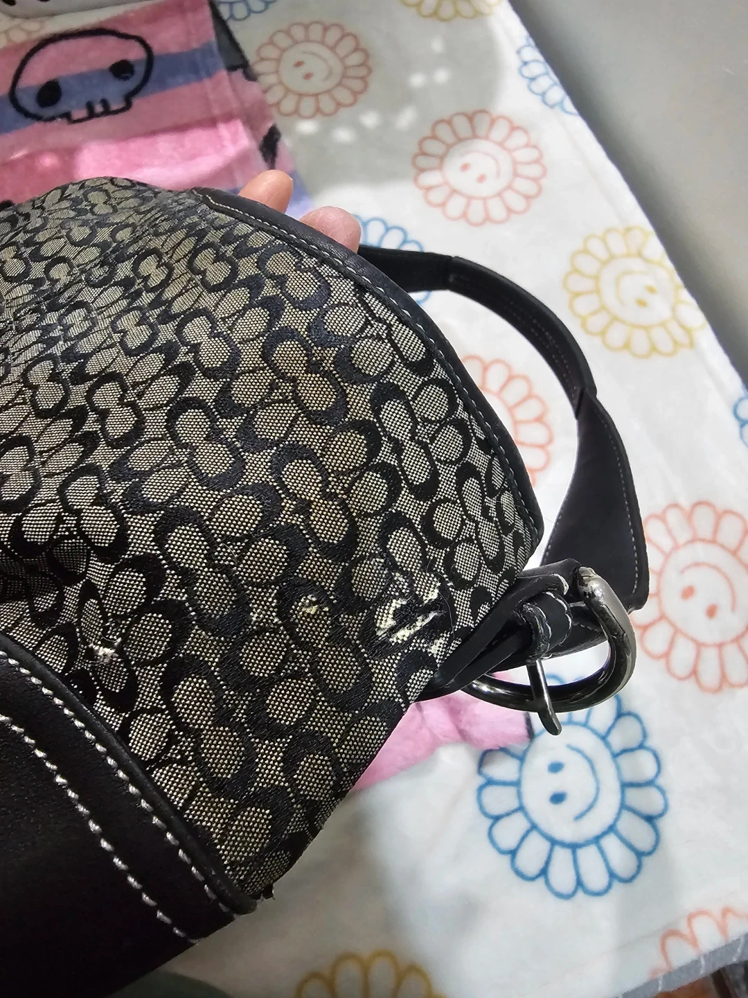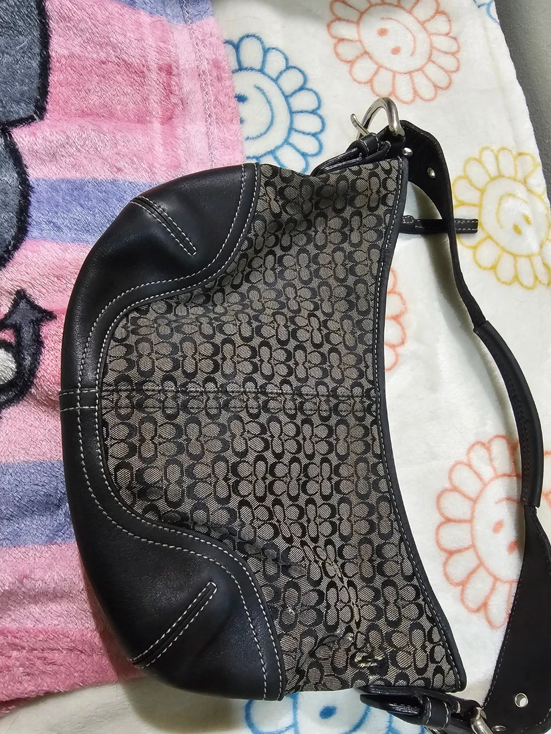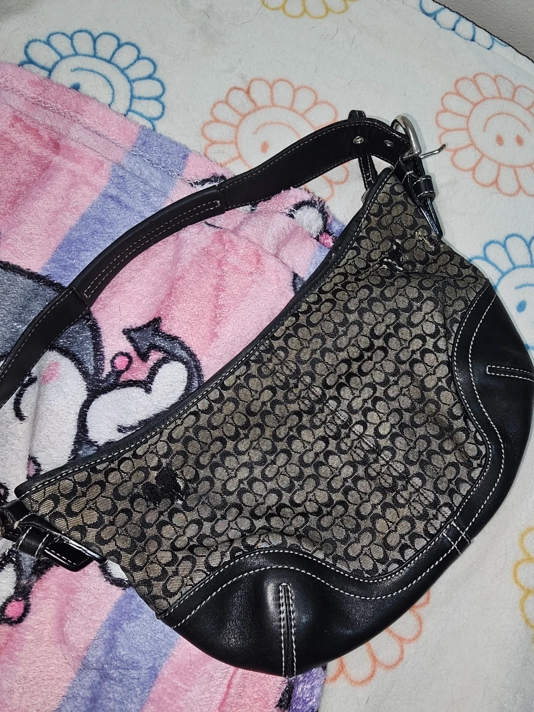 This is a Coach shoulder bag with the signature monogram pattern. It's made from coated canvas and leather trim. The bag features a single strap and a zip-top closure. This bag is fair ( wear on it ) Please zoom in the photos Pick up in queens 11369