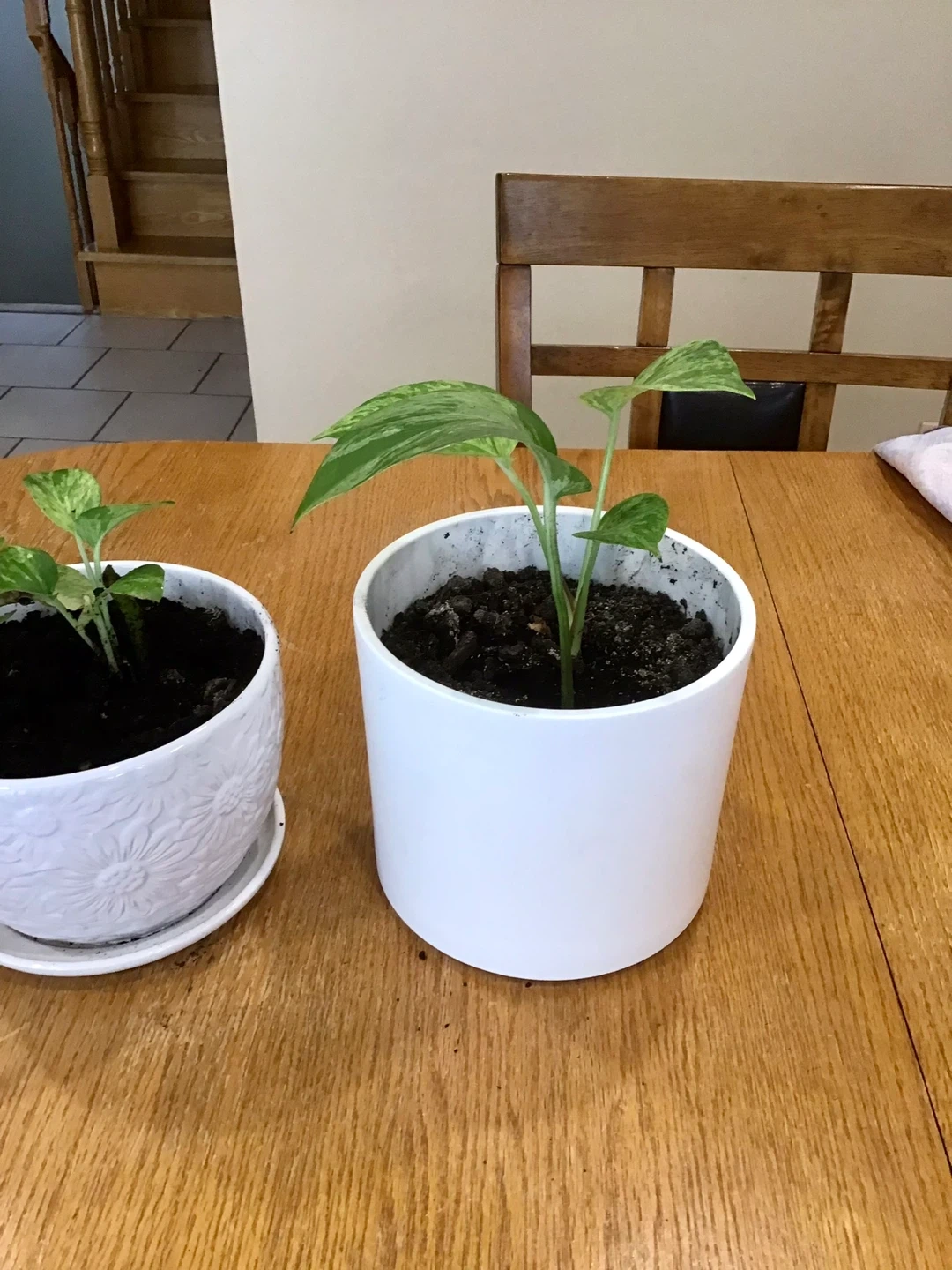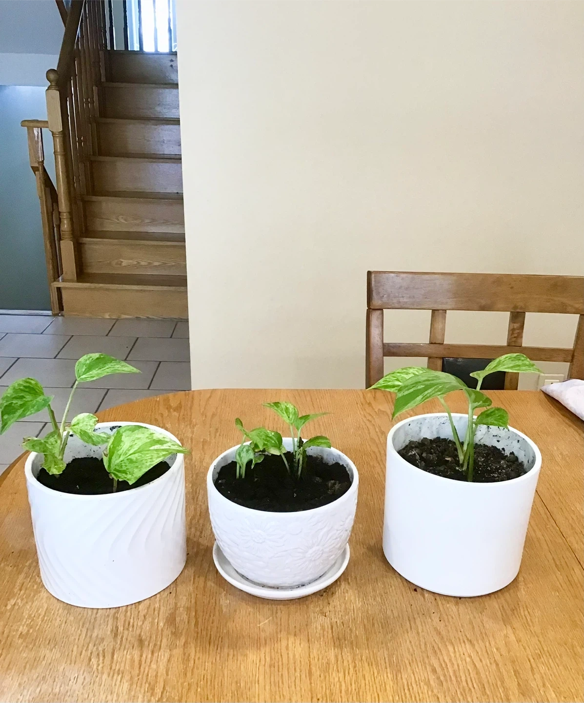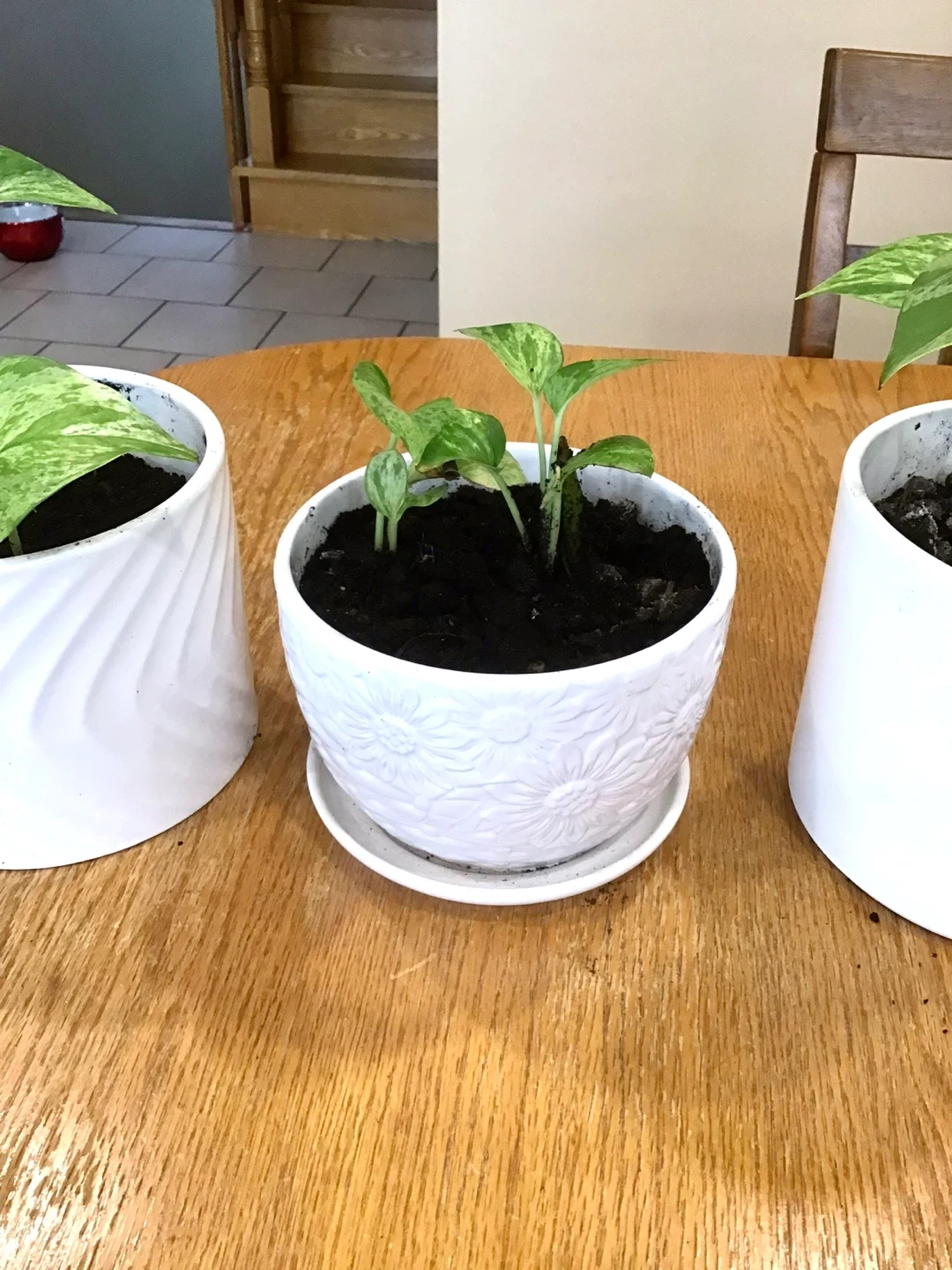 Three healthy Pothos plants are ready for a new home. Each plant comes in a decorative white ceramic pot with a saucer. These plants are known for being easy to care for. Add a touch of greenery to your space!