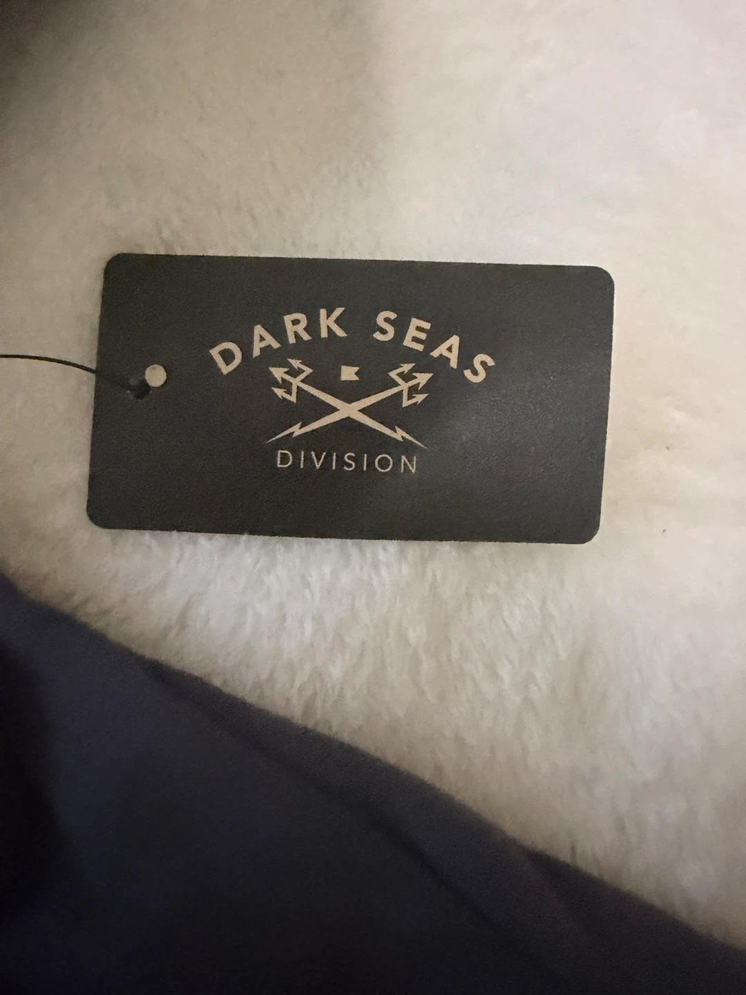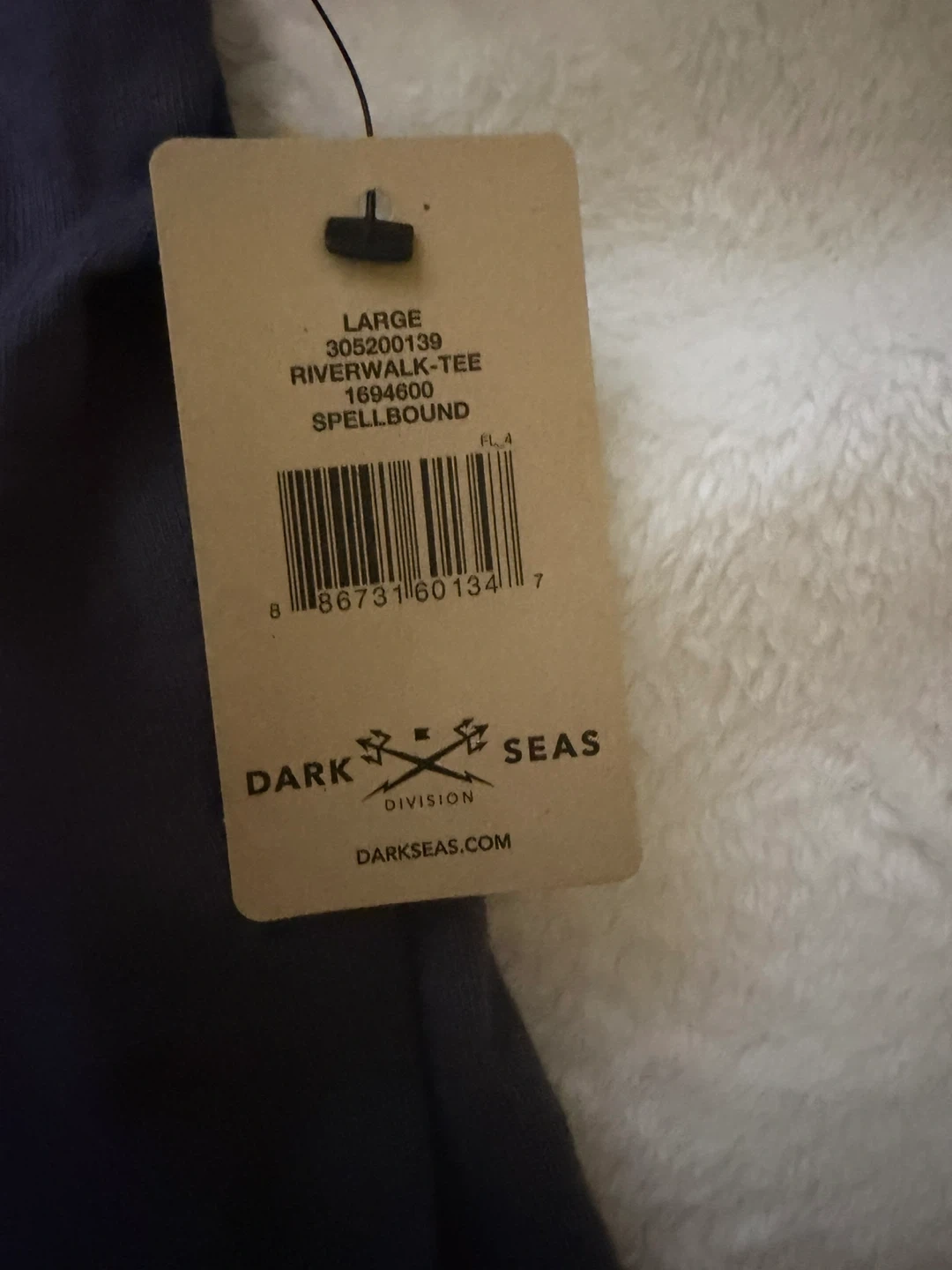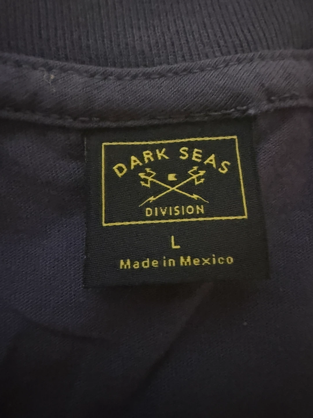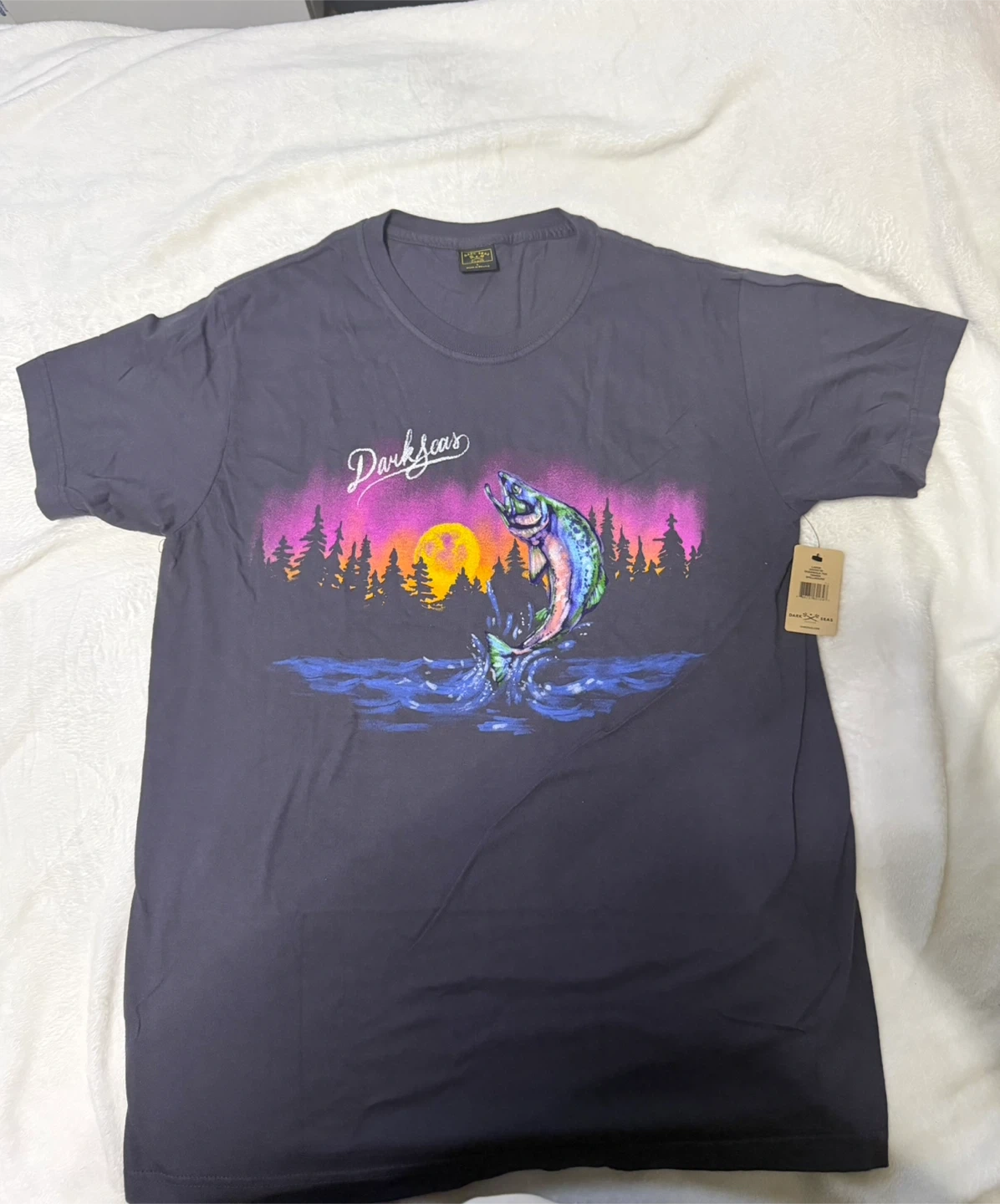 Dark Seas Division men's graphic t-shirt. Features a jumping salmon design with a sunset and trees. Made in Mexico. Cotton material.