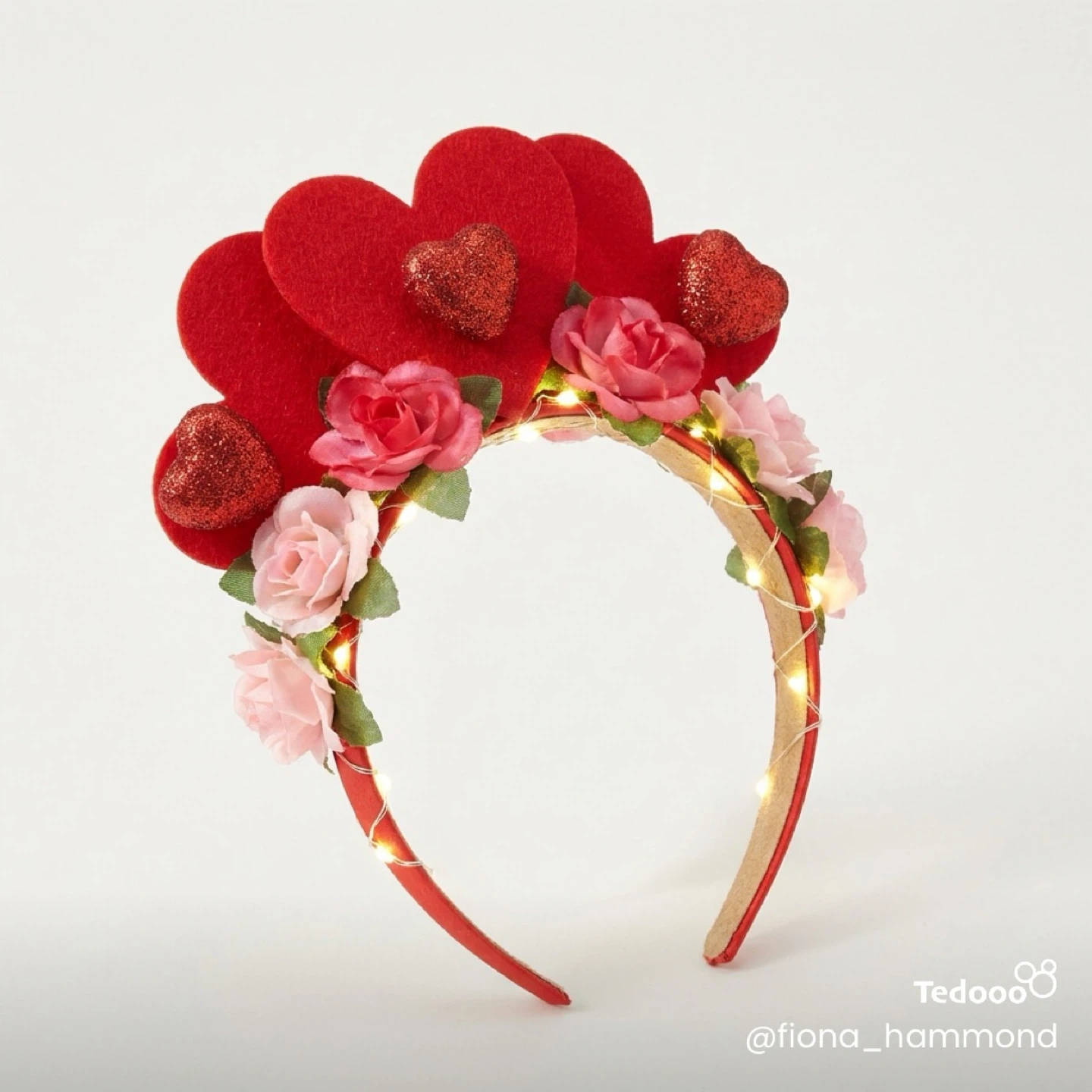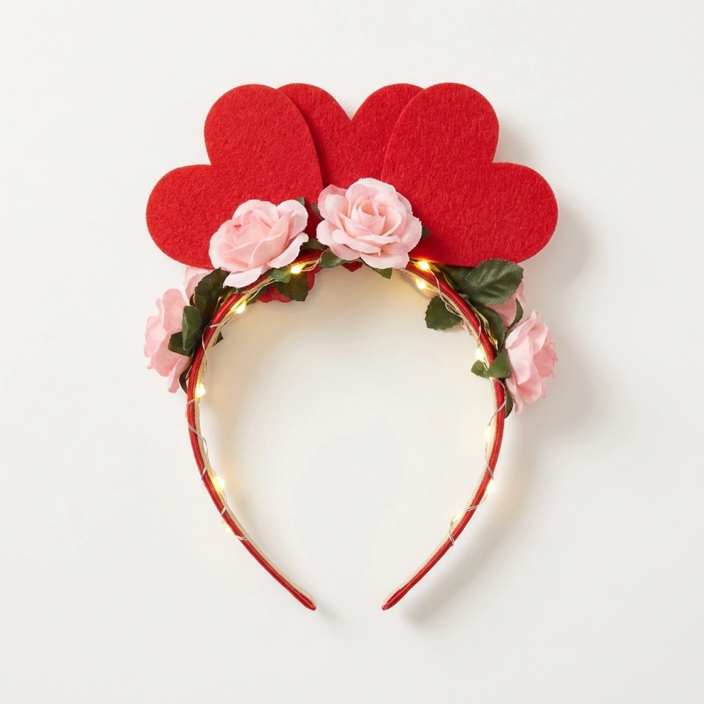 Festive red headband decorated with felt hearts and faux pink roses. It's adorned with small, warm LED lights for a charming touch. This is a one of a kind, curated piece. Perfect for parties or adding a bit of sparkle!