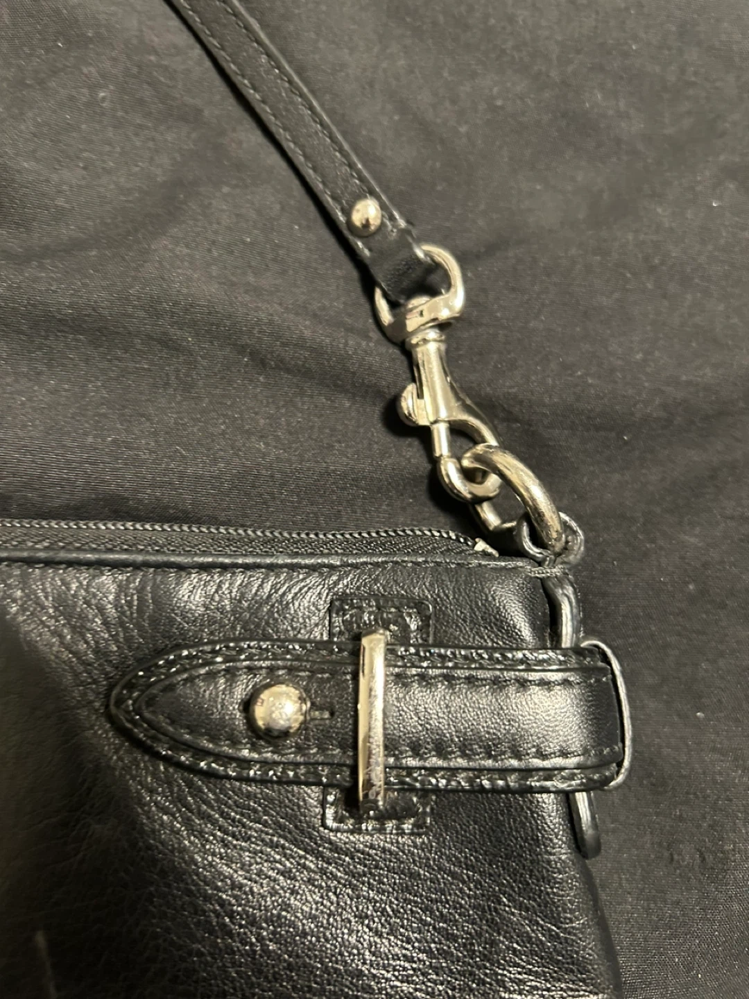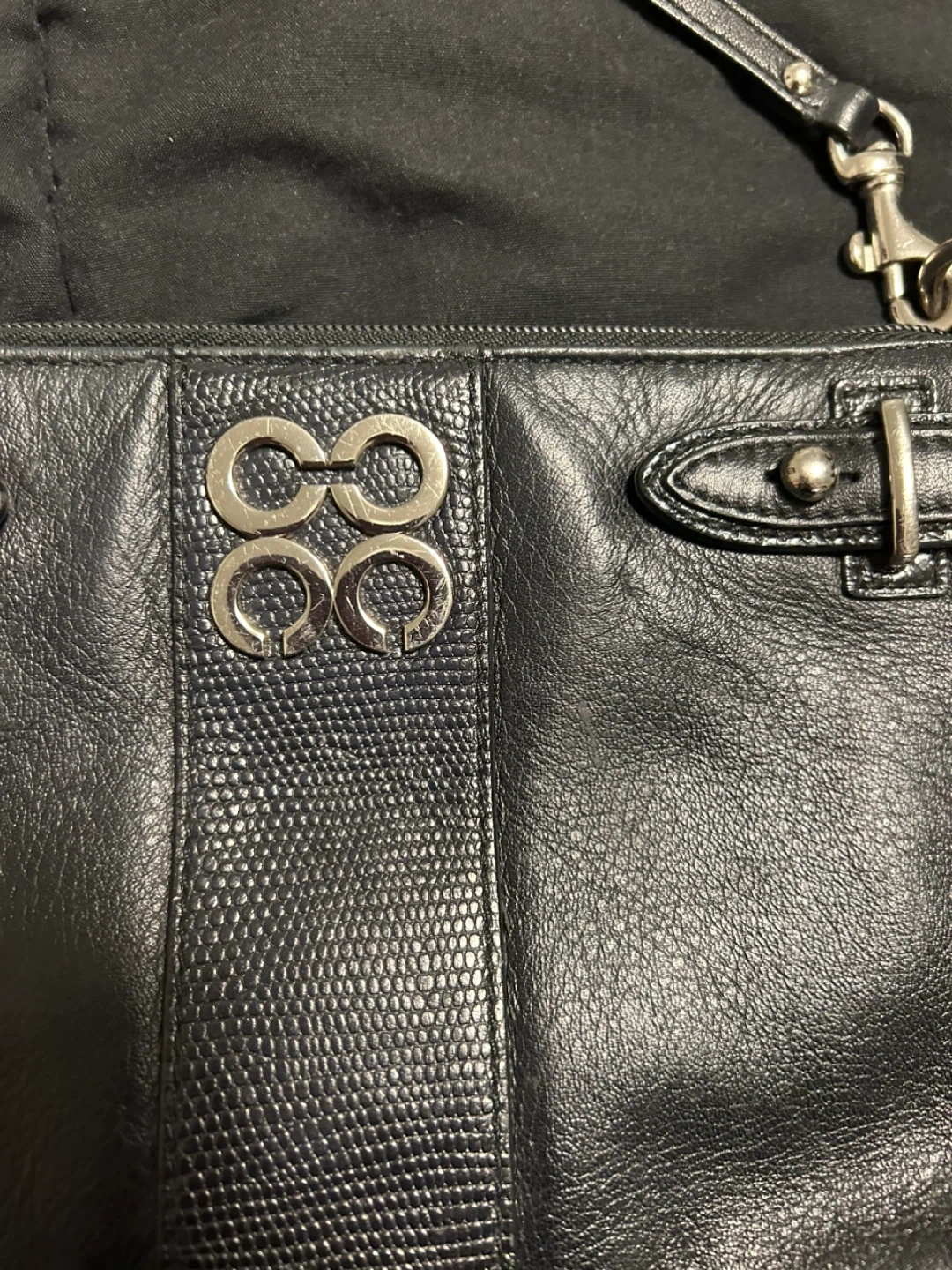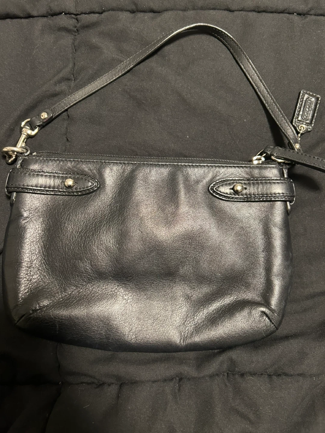 This is a black leather clutch wristlet from Coach. It features a textured panel on the front with the signature Coach "C" logo. The wristlet has a zippered closure and a detachable strap with a silver clip. It's perfect for carrying essentials when you're on the go! The leather is in very good condition; only the inside is dirty. 24 cm wide x 18 cm long
