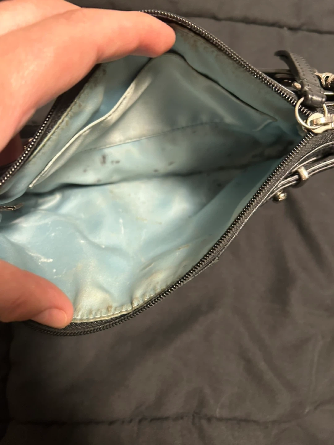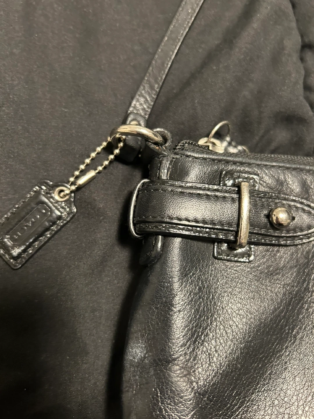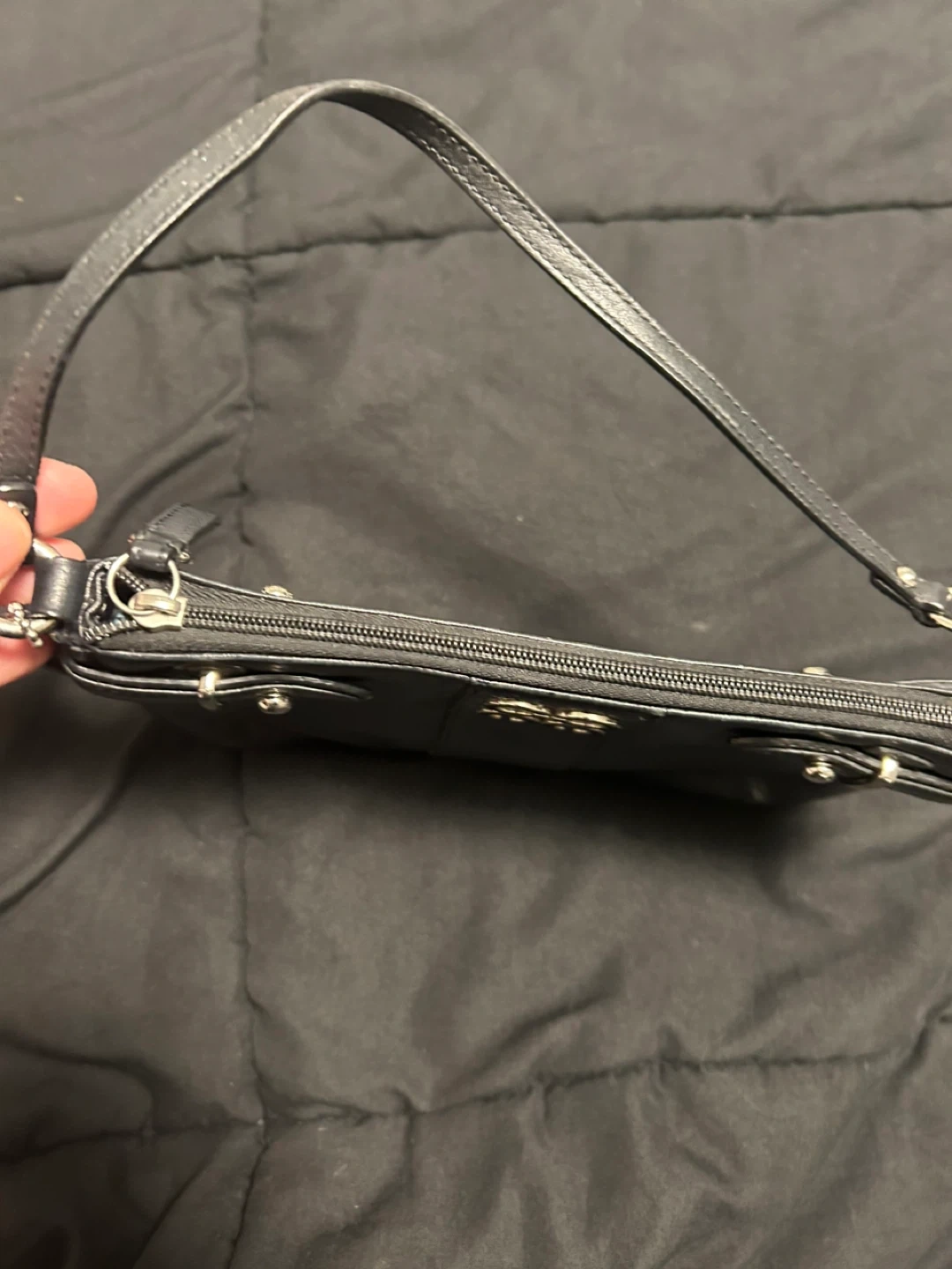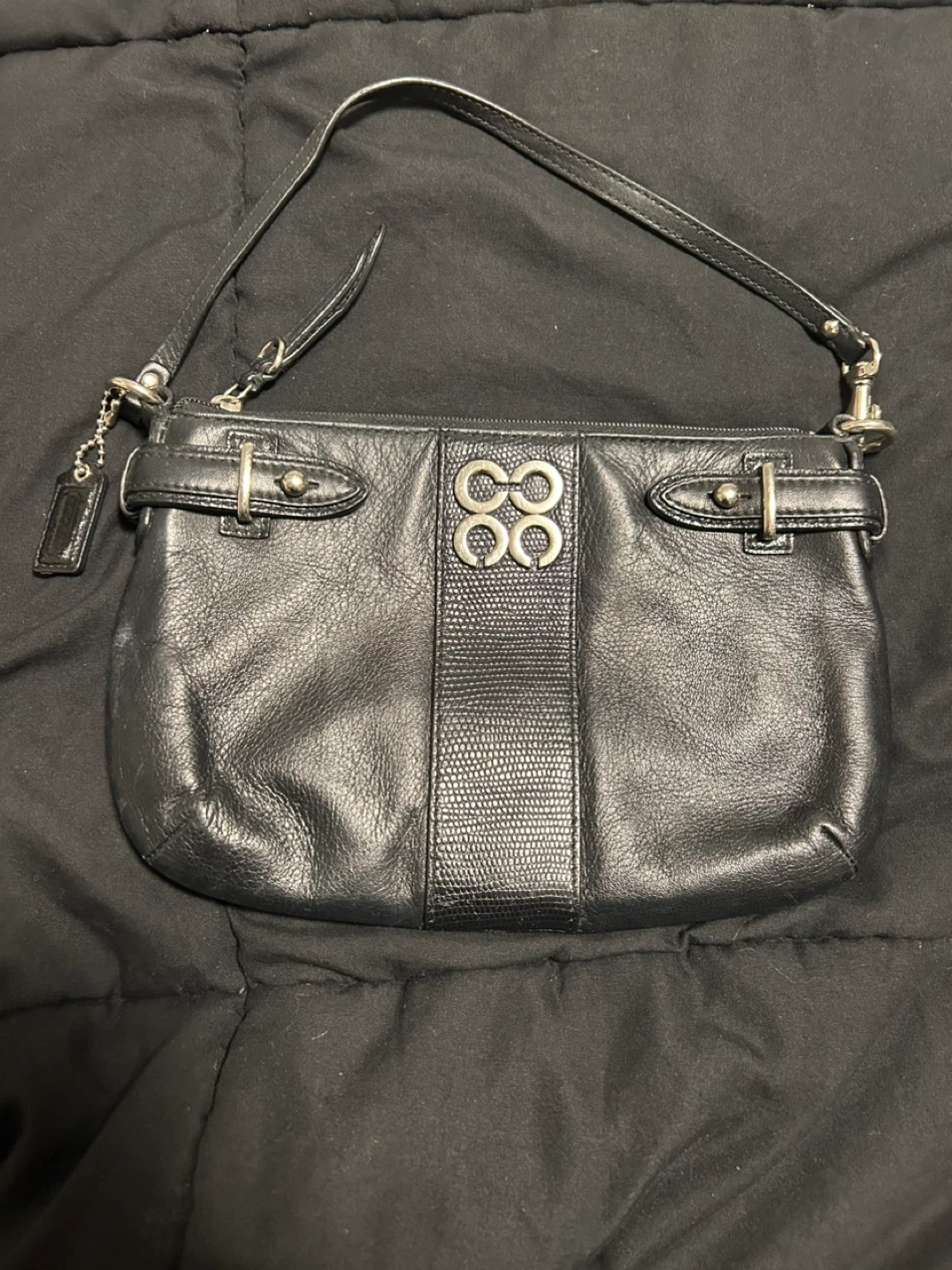 This is a black leather clutch wristlet from Coach. It features a textured panel on the front with the signature Coach "C" logo. The wristlet has a zippered closure and a detachable strap with a silver clip. It's perfect for carrying essentials when you're on the go! The leather is in very good condition; only the inside is dirty. 24 cm wide x 18 cm long