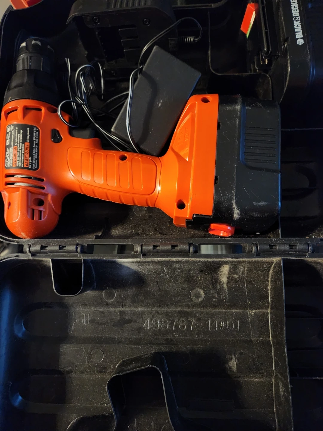 This is a Black & Decker cordless drill. It comes with a charger and is orange and black in colour. The drill includes a case.