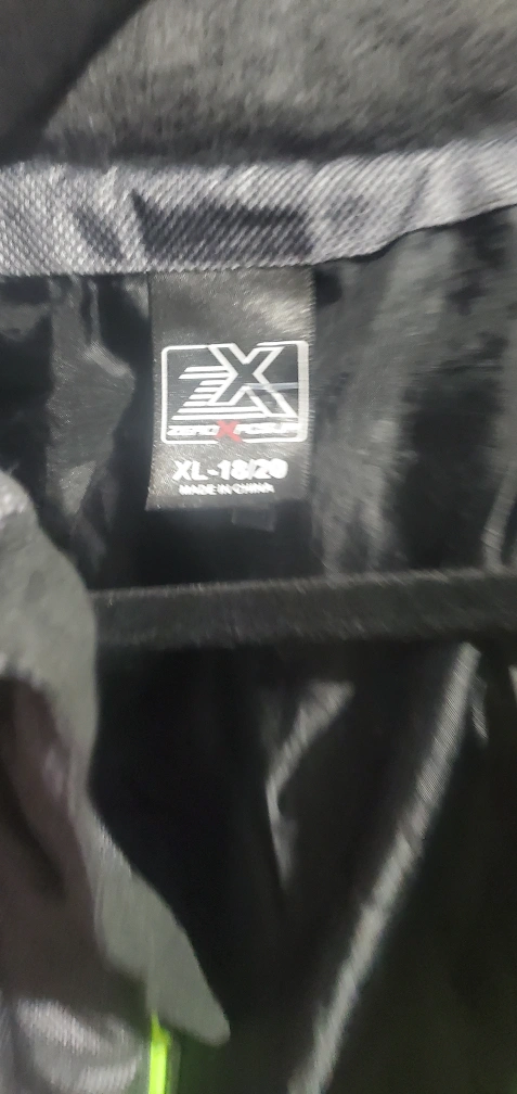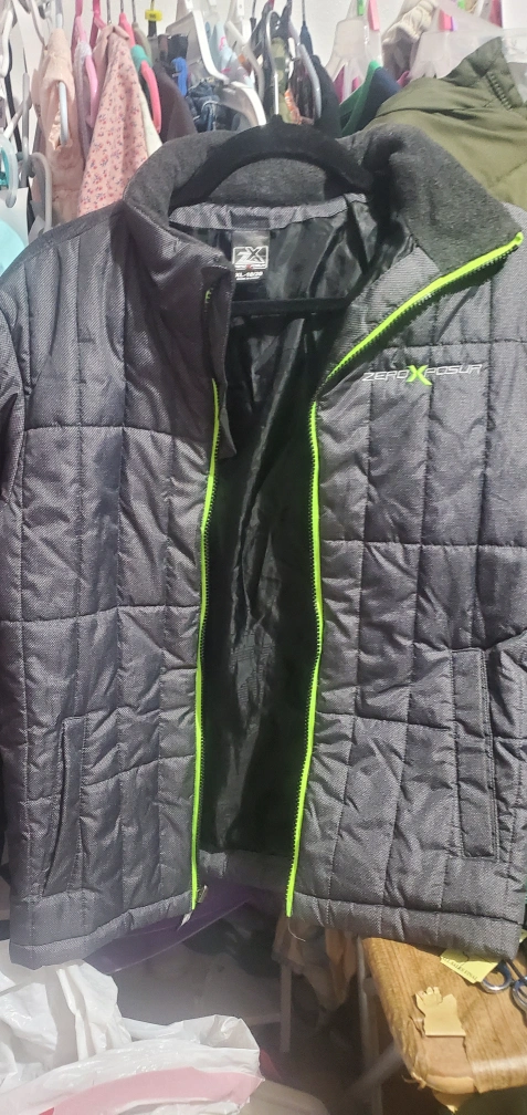 This Zero Exposure jacket is quilted and features a neon green zipper detail. It's a size XL (18/20). Made in China. This jacket is suitable for cooler weather.