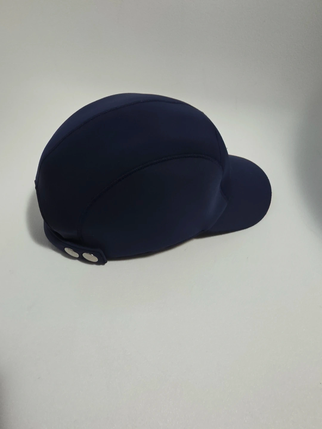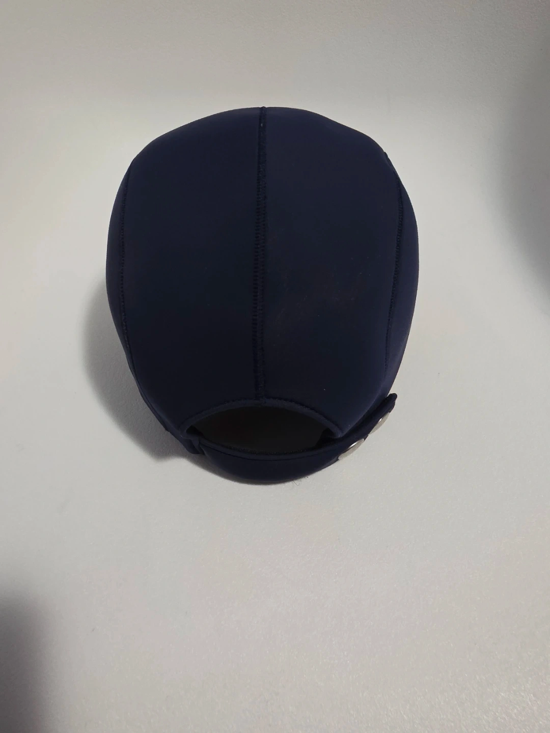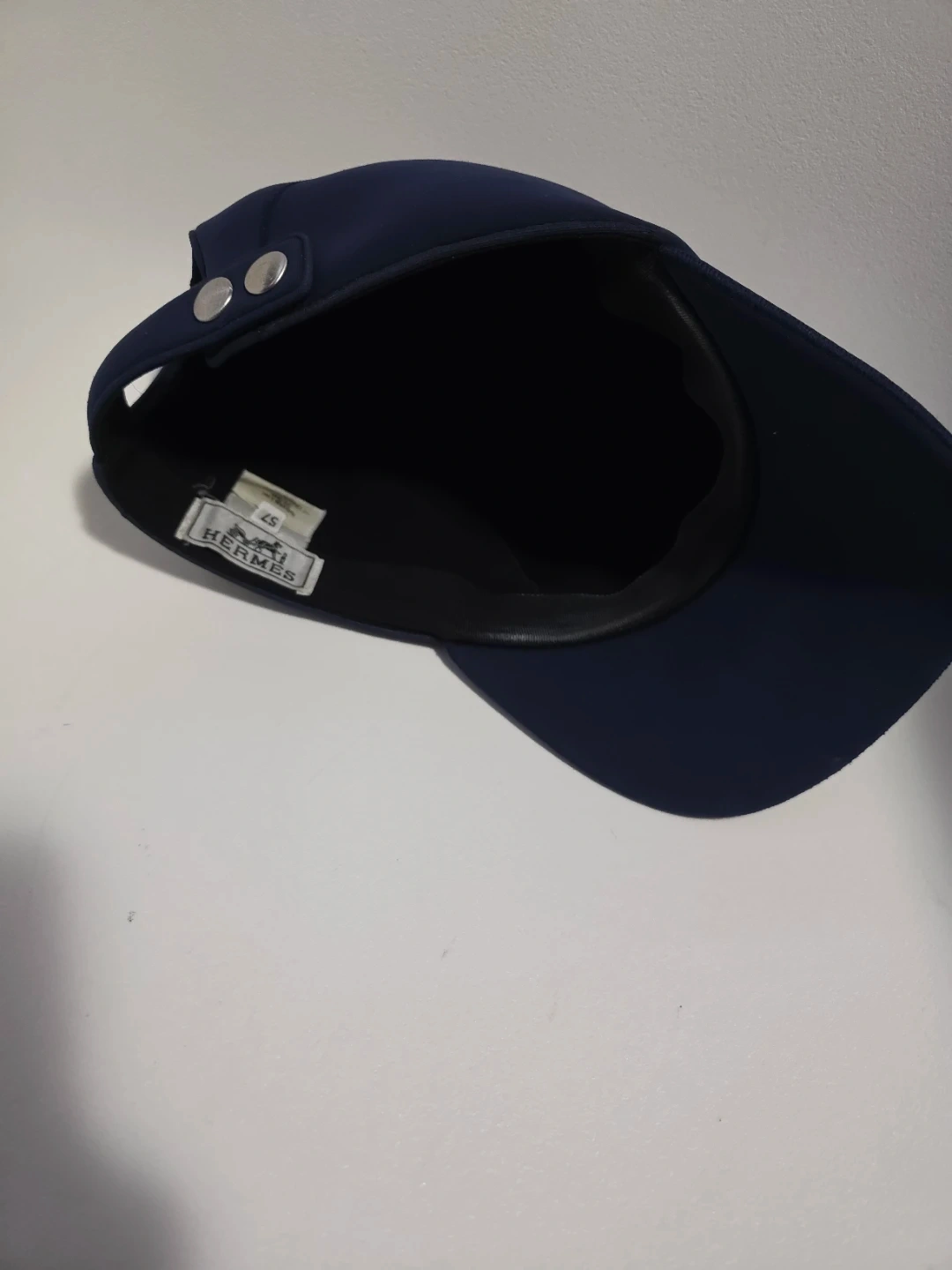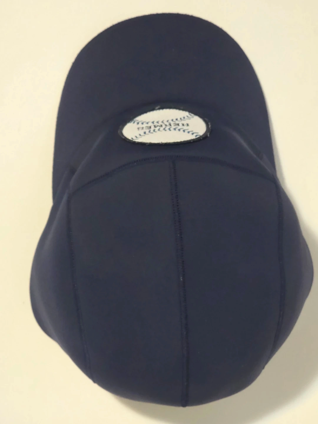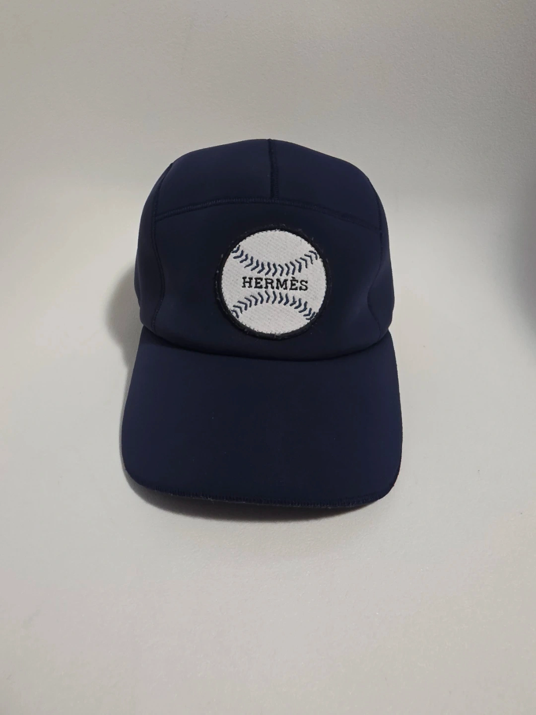 Navy blue Hermès baseball cap. Excellent condition and gently used/Liked new. Features a white circular patch with a baseball stitch design and the Hermès logo. Adjustable strap at the back.