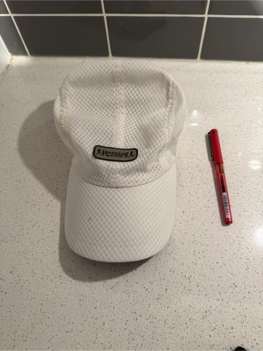 This is a white mesh cap from Running Room. It's made of breathable material, perfect for outdoor activities. The cap is lightweight and comfortable for active use.