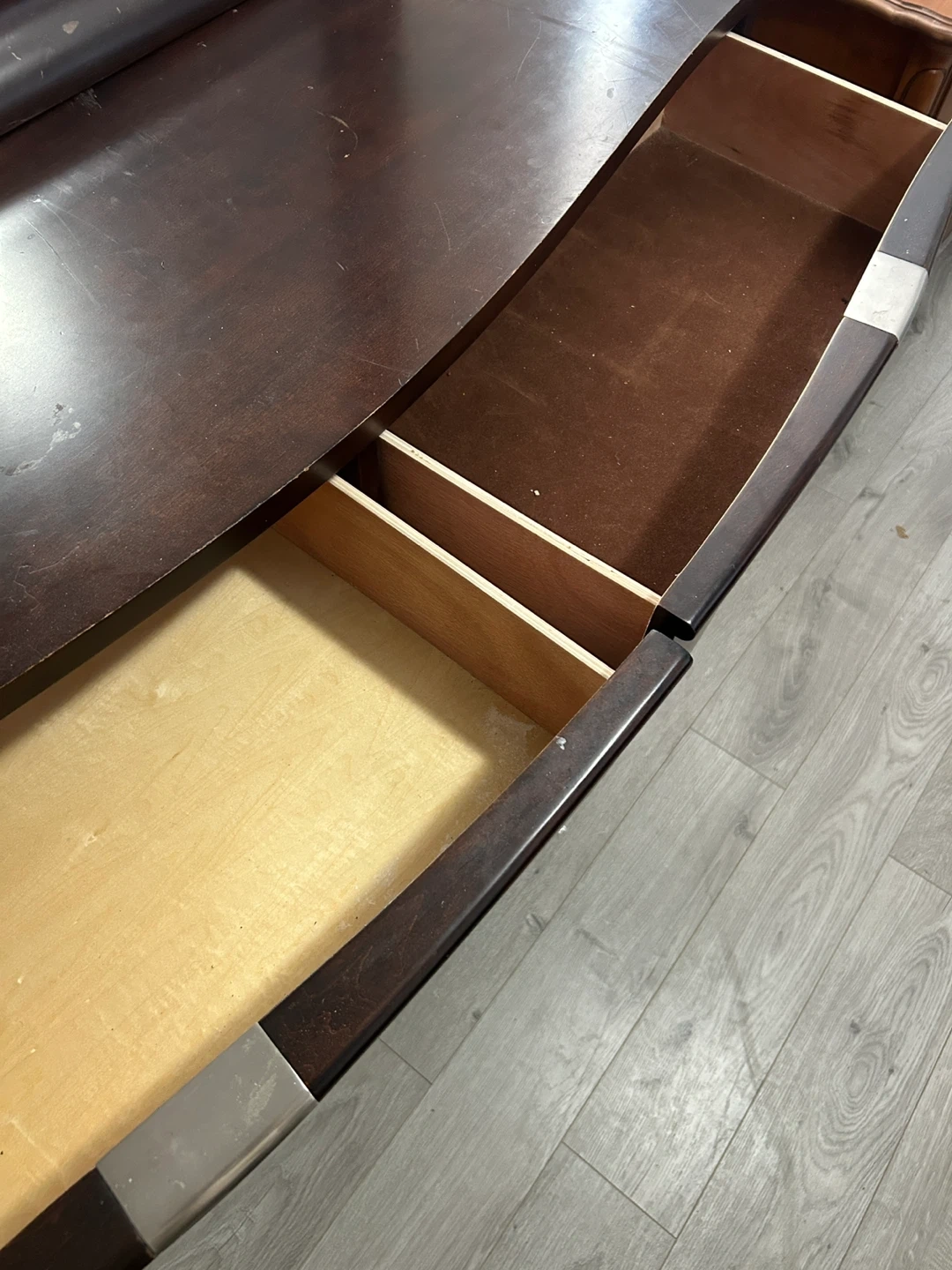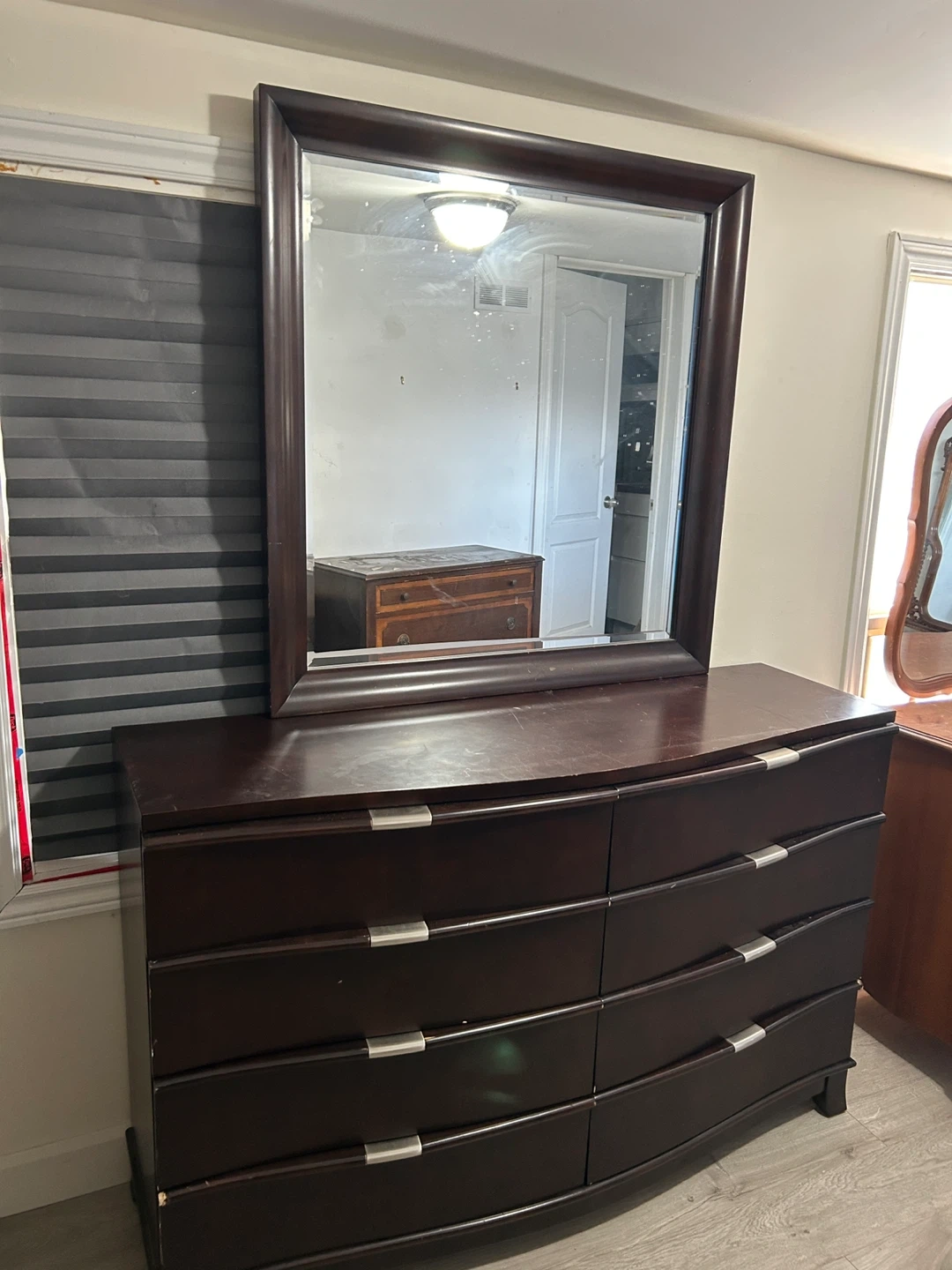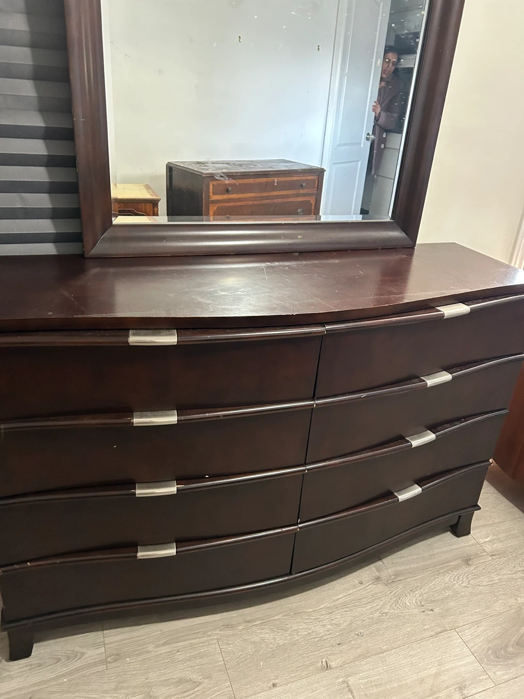 Selling a dark brown dresser with a matching mirror. It features 8 drawers for ample storage. The dresser has a curved design with silver-tone handles. The mirror has a thick, framed edge.