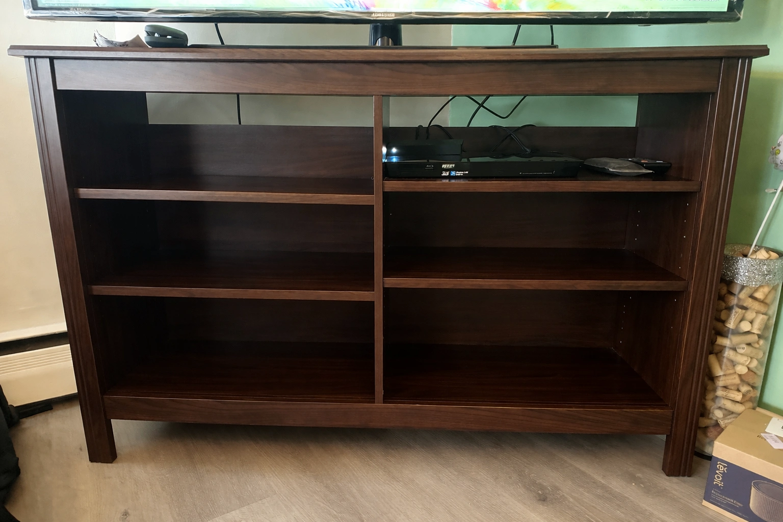 I'm selling a wooden TV stand or media console. It has a nice, dark wood finish and plenty of shelf space for your media devices and accessories. It's in good condition and ready for a new home!